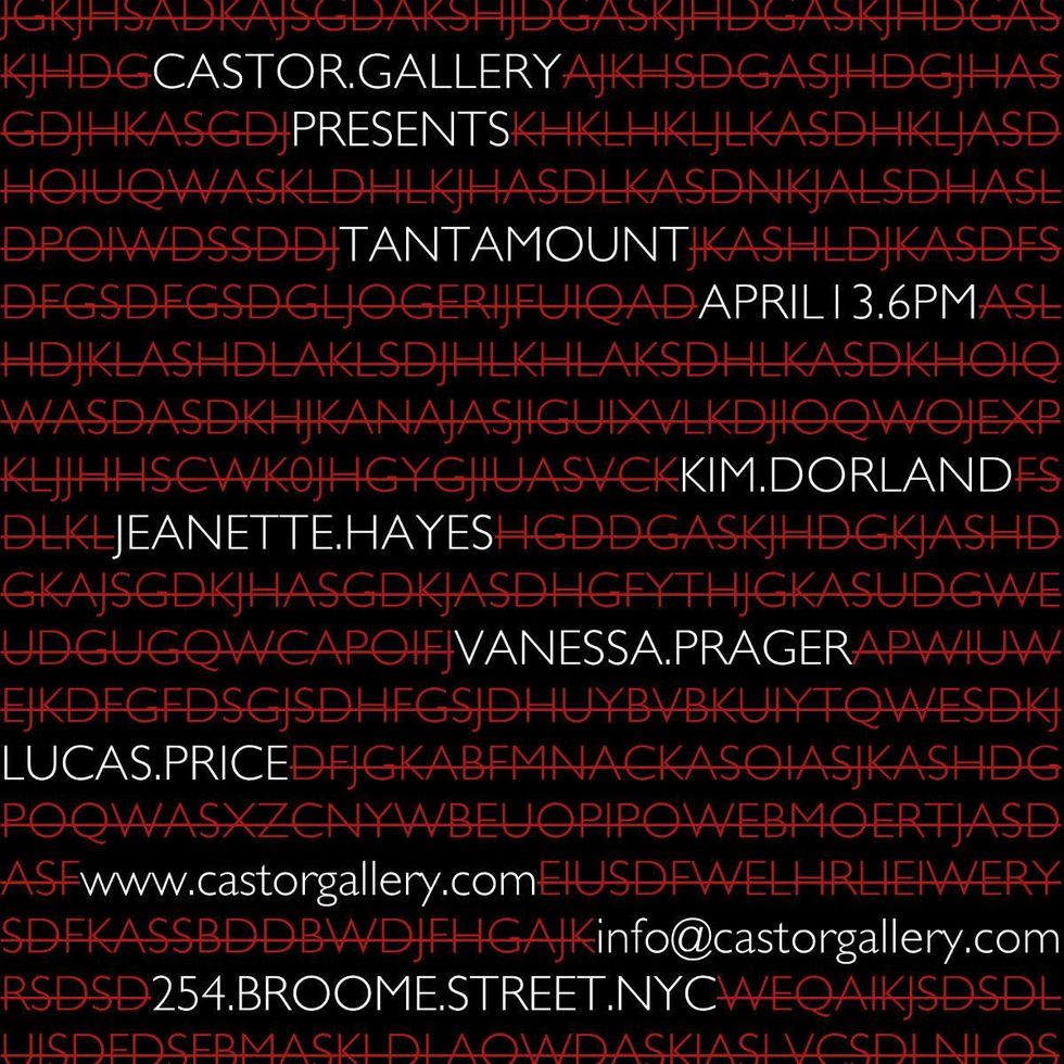 Castor Gallery (254 Broome Street) has a group show called "Tantamount" opening on April 13, 6 to 8 p.m., featuring new work from four artists: Kim Dorland, Jeanette Hayes, Lucas Price and Vanessa Prager. All use unique oil techniques. Up until May 14.