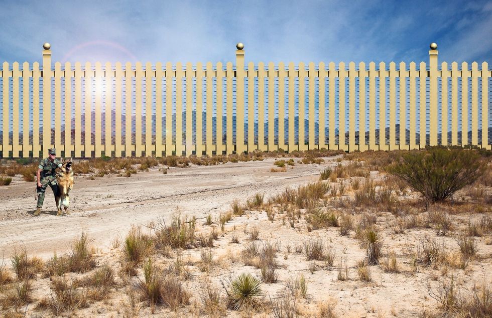 "Presented here is a wall concept as contrived through the Trumpian lens," the group explains in a statement. "We propose that a prototype be installed around the Mar-a-Lago compound to make it easier for Mr. Trump to review. This would serve productive on multiple fronts. It would be a legitimate constructibility [sic] test, It would provide a practical assessment of real cost. It would allow for aesthetic refinements (correct gold finish, proper picket scale, finial shape, etc.). The lethal shock system could also be tested (in this case, the electrified side would be on the inward side to keep the dangerous people from getting out)."