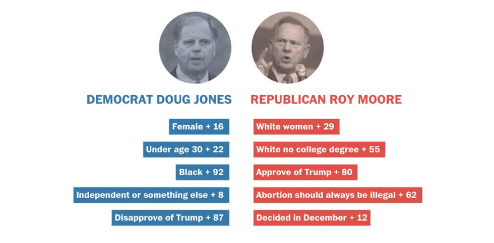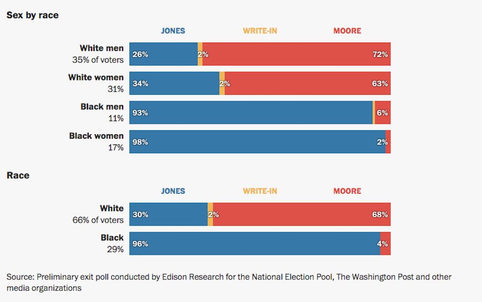 This year's Alabama senate race between Republican Roy Moore and Democrat Doug Jones evolved over the course of its run from a typical local state election into a litmus test for the direction of the country's political and cultural future. Though several allegations of sexual predation against women and minors by candidate Roy Moore were made during the campaign (not to mention his controversial political past, including refusing to remove a statute of the Ten Commandments in a government building), the very fact of Alabama's demographic makeup and history as a very red state led many experts to predict he would win. He didn't, and exit polls indicate that we primarily have black women to thank for that.