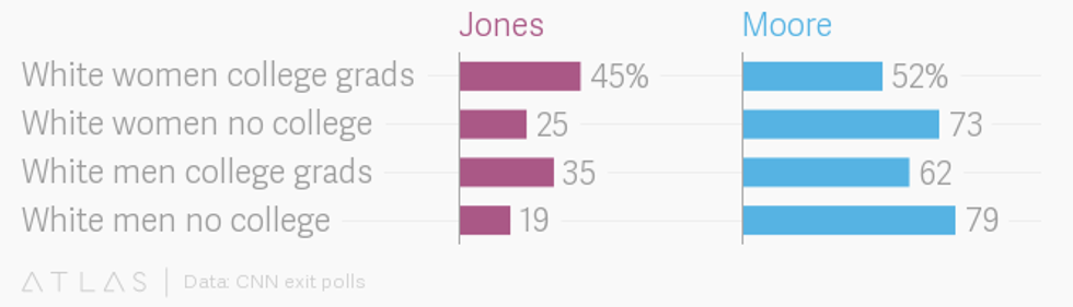 Polls by CNN also found that 63% of white women voted for Moore, who has called Islam a " false religion" and has been an extremist voice against LGBT rights. What's more, 50% of the white women who backed Moore hold college degrees (62% of white men with college degrees also voted for Moore, as did 72% of white male voters overall).
