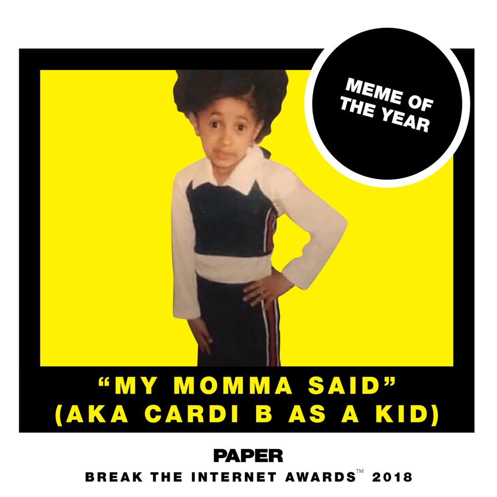 The "My momma said" meme is better than all the rest. As if Cardi B hadn't endeared herself to us enough with her unfiltered videos and stream-of-conscious monologues about her daily life in the limelight, the meme featuring Baby Belcalis as the annoying little sister that somehow always throws a wet blanket on every occasion took us all back to our childhoods for a good laugh. — Claire Valentine