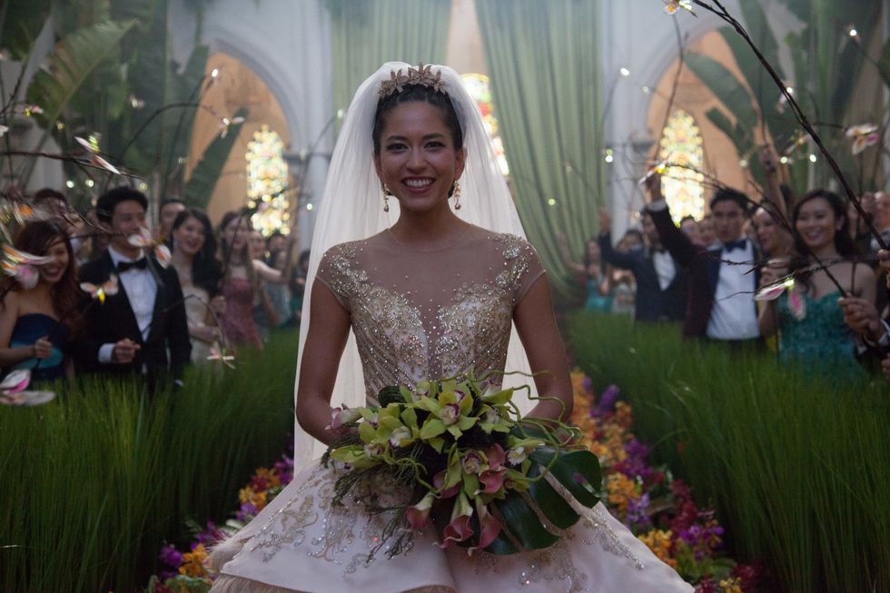 It is a very big deal. The costumes for Crazy Rich Asians, which is headed for a $30 million opening, needed to dazzle, and Vogt made it happen. The movie had a $30 million budget, and naturally drips with money. Characters wear designs from houses like Dior and Ralph Lauren, and the jewelry pops. Many of the standout pieces came from bespoke Hong Kong jeweler Carnet — Kwan told Time's Karen K. Ho that his characters would never wear Cartier, because it's "too common for these women." Michelle Yeoh as imperious matriarch Eleanor Young wears a $300,000 Michelle Ong brooch as a belt buckle. A big wedding scene features a custom, Vogt-designed wedding dress worn over a jumpsuit covered in Swarovski crystals. The clothes are opulent.
