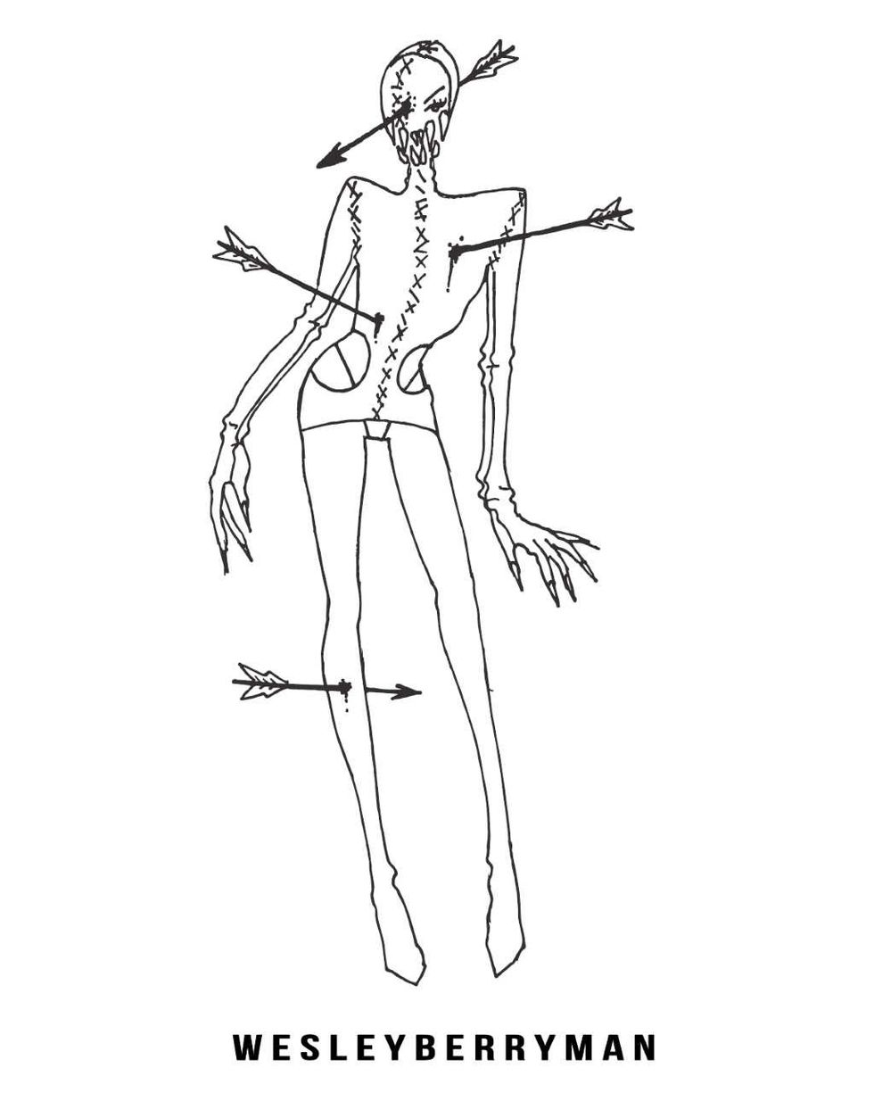 Wesley Berryman, the soi-disant emo kid turned designer from Tennessee, has created bewitching custom ensembles for Beyoncé's On The Run II Tour wardrobe, an FKA Twigs performance, and Bella Hadid's cover shoot for the 2016 Winter Issue of PAPER. He's brought the same noir magic to his Saint Sebastian-esque Halloween costume. "She's a ghost of the call girl she once was," he says of his Biblical martyr bound to walk the earth for rest of eternity. "She still has time for a fresh manicure before devouring the souls of those who condemn her."