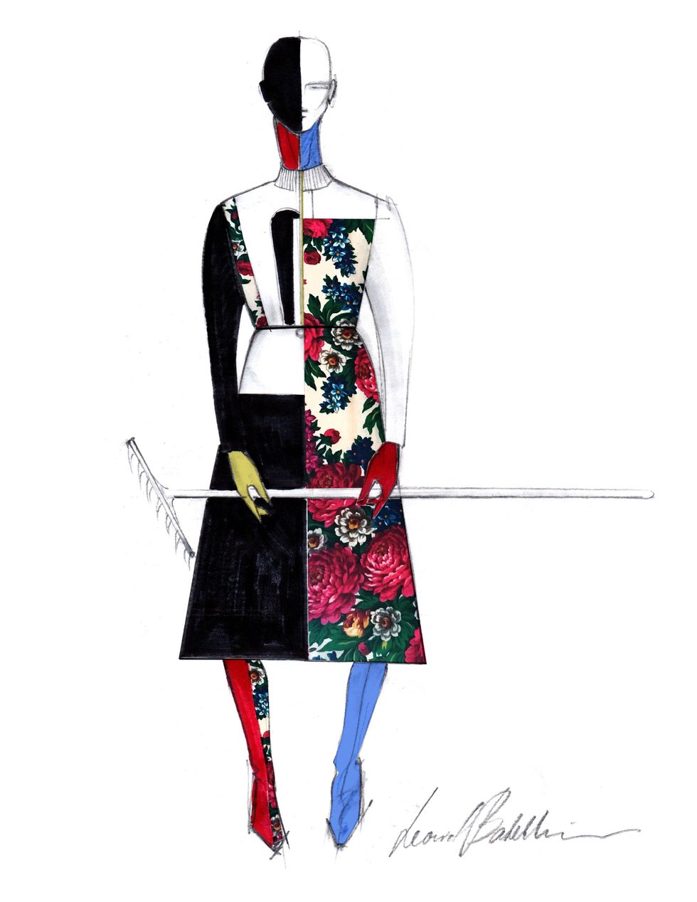 Moscow-born designer Leonid Batekhin turns industrial waste scarves from Russian factories into malleable unisex pieces for his label Occhii (named after the Russian word for eyes). Works by the late Neo-Supremacist artist Kazimir Malevich inspired the designer's debut collection and resurface for Halloween. Here, Batekhin reinterprets the avant-gardist's vibrant 1932 painting Woman with Rake by working in the kerchiefs of his home country.