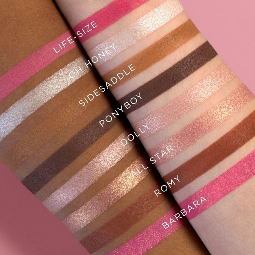 The cruelty-free, paraben-free, and gluten-free collection includes six versatile shades, which have country-chic names ranging from Ponyboy to Dolly (of course); matte watermelon pink blush and a lip color, called Barbara, an homage to Barbie. Which, by the way, the press statement announcing the line points out, is the full name of Barbie: Barbara Millicent Roberts, if you're nasty.