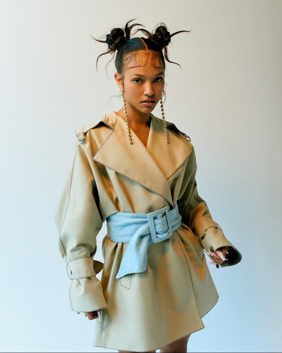 Coat: Opening Ceremony, Belt: Deborah Drattell, Earrings: Jennifer Fisher