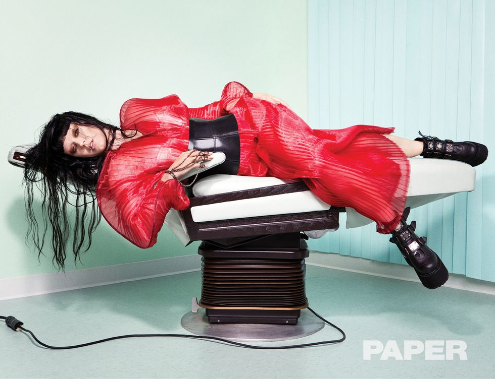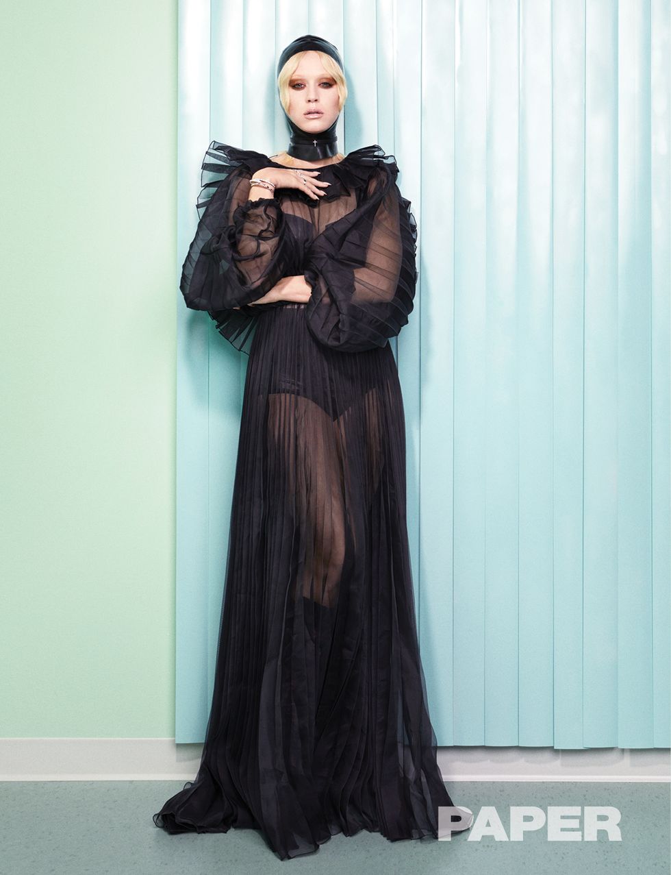 Dress: Valentino, Hood: Vex, Lingerie: Dead Lotus Couture, Boots: Gareth Pugh, Jewelry: Bulgari