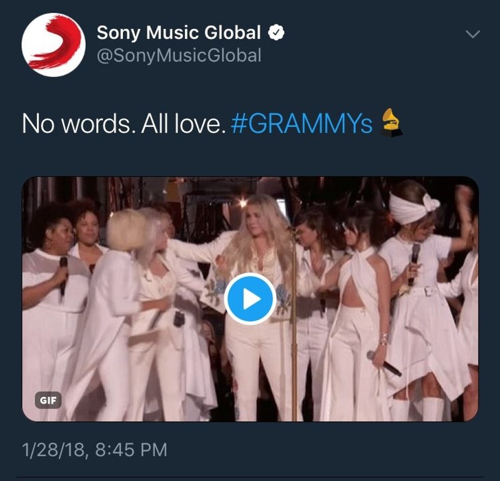 In a now-deleted tweet, the record label wrote, "No words. All love. #GRAMMYS," garnering instant backlash from Kesha fans.