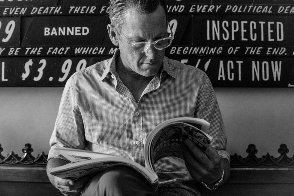 Pretty soon a freshly scrubbed Armstrong ambles downstairs — gray slip-on shoes on his feet — and gets in front of the photographers' camera, gamely following instructions to turn his head just so or train his gaze in a particular direction. He laughs and jokes throughout the photo session and, for the final shot, indulges us by putting on his new clear-framed reading glasses that he says he recently ordered for cheap off Amazon.