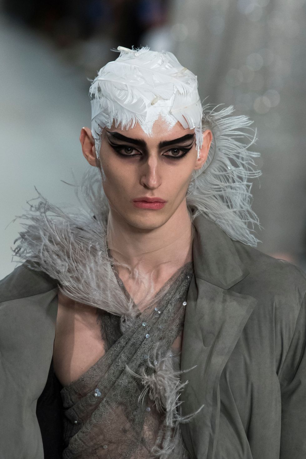 For the makeup, Pat McGrath stuck to a minimalist no-makeup look, perhaps in an effort to highlight the sculptural head pieces, at least for the first few models. Further into the show, however, an occasional streak of dramatic zig-zag eyeliner or ultra-dark eyeshadow and brows dropped onto the runway to echo the brand's signature boldness.