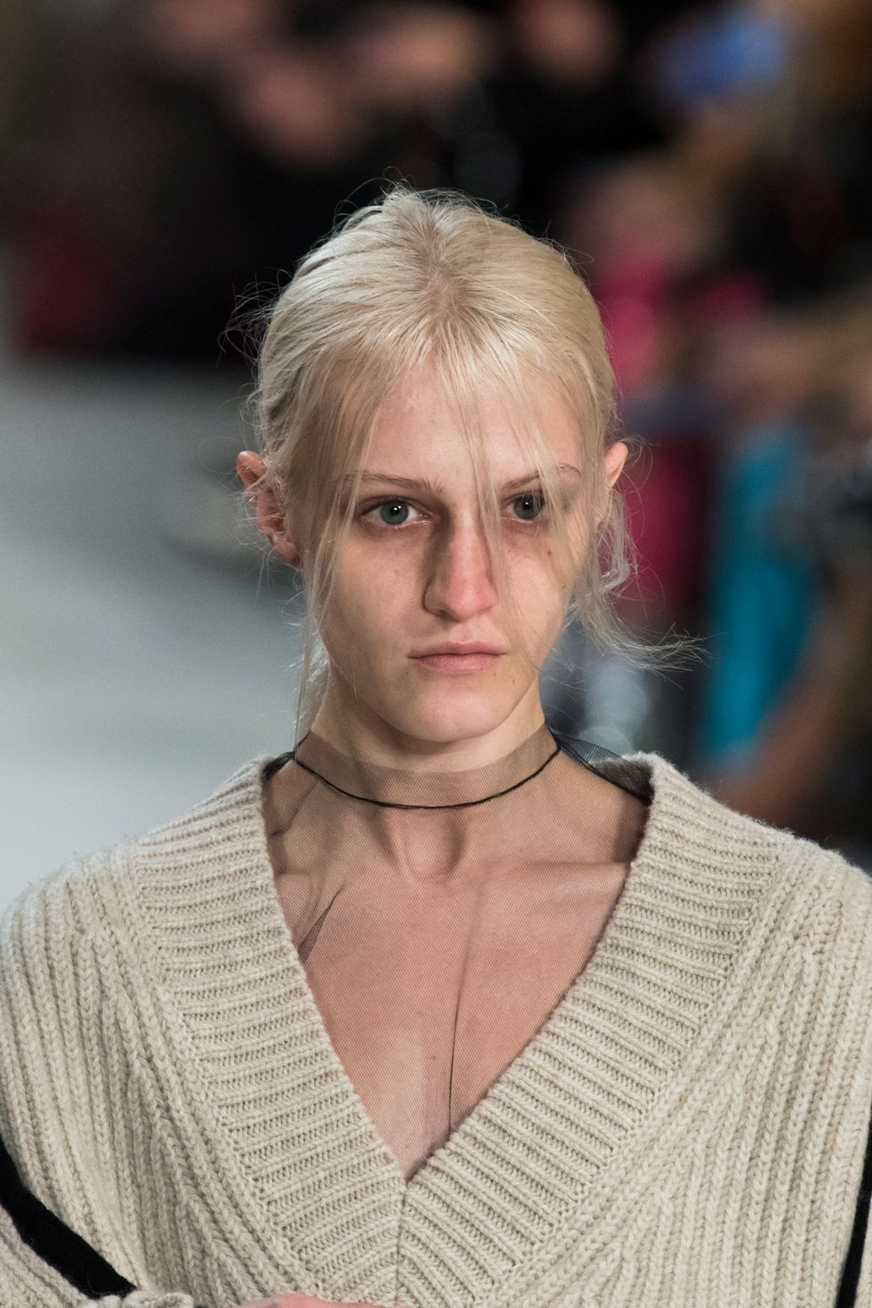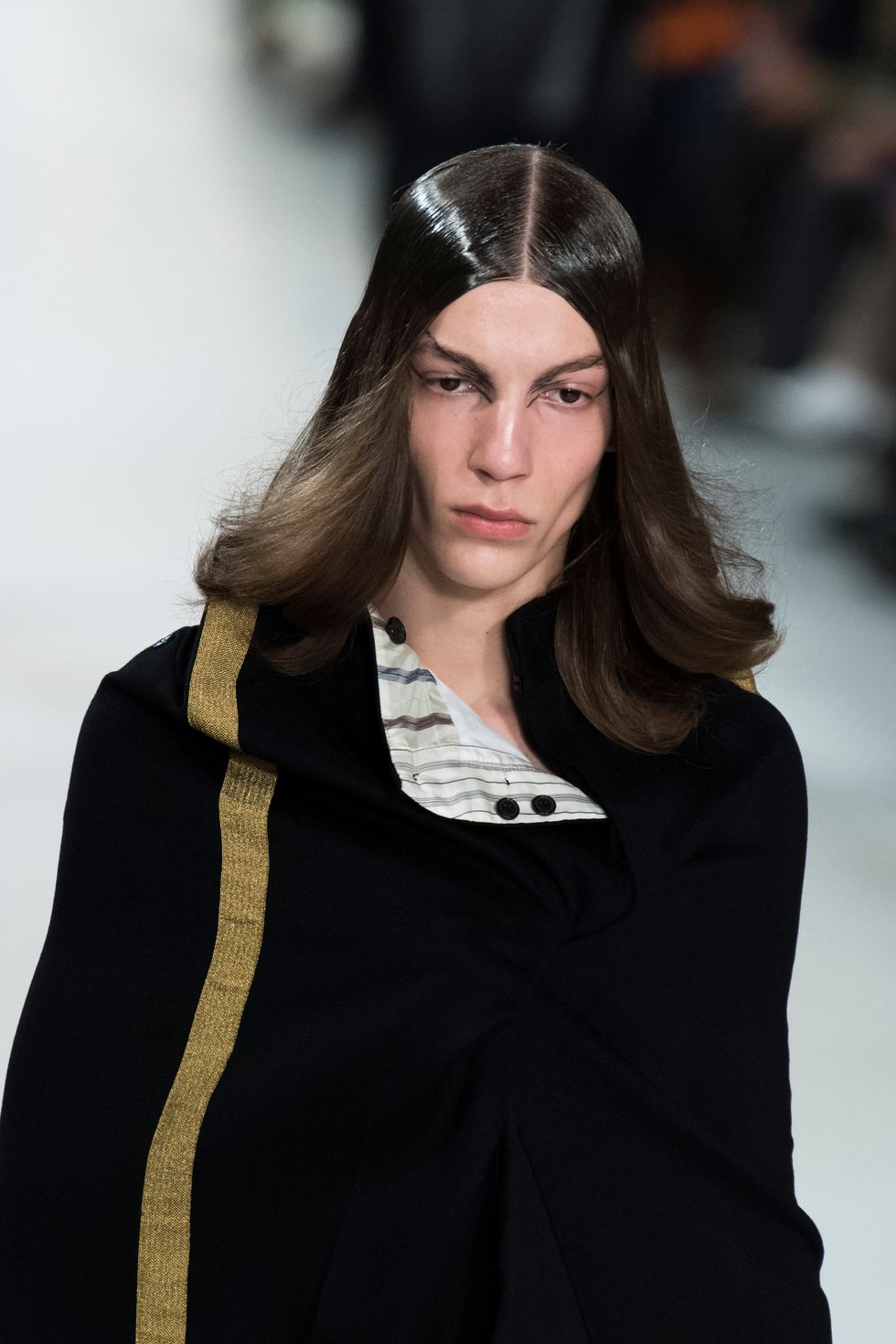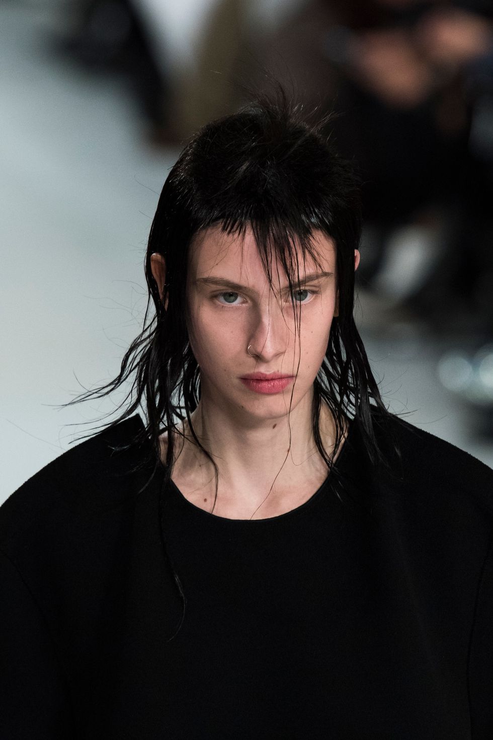 The more somber and natural looks for the show were infused with grunge-y elements in the form of independent, messy strands of hair or a bold uneven fringe. These boyish, haphazard styles juxtaposed the other models' glossy, streamlined hair.