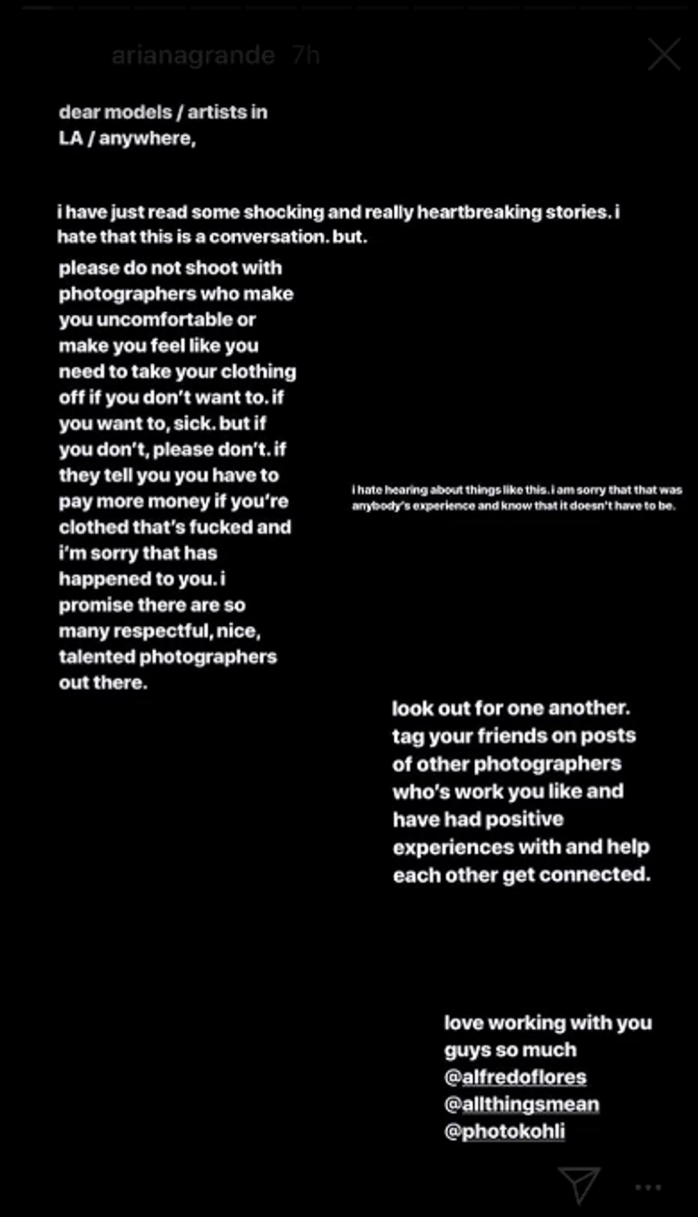 Grande swiftly took to her Instagram story to respond to the allegations. Without naming Hyde directly, the 26-year-old singer said called the stories "shocking and really heartbreaking," and urged her followers not to shoot with photographers for whom nudity is a requirement or coerced experience. "[I]f they tell you you have to pay more money if you're clothed that's fucked and i'm sorry that has happened to you," she wrote. "[I] promise there are so many respectful, nice, talented photographers out there." Grande then tagged three photographers she's had positive experiences with: Alfredo Flores, Ricky Alvarez and Stefan Kohli.