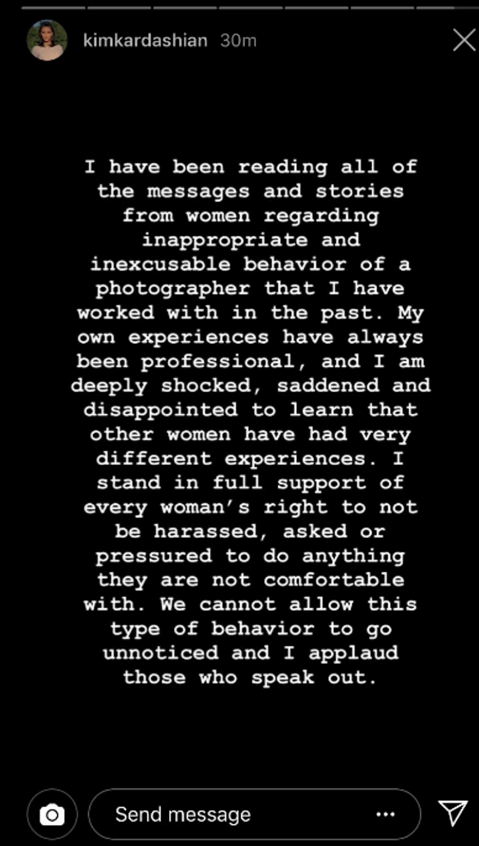Kim Kardashian also addressed the allegations against Hyde on her Instagram story, writing, "I have been reading all of the messages and stories from women regarding inappropriate and inexcusable behavior of a photographer that I have worked with in the past." The reality TV star and KKW Beauty mogul continued, "My own experiences have always been professional, and I am deeply shocked, saddened and disappointed to learn that other women have had very different experiences. I stand in full support of every woman's right to not be harassed, asked or pressured to do anything they are not comfortable with. We cannot allow this type of behavior to go unnoticed and I applaud those who speak out." Hyde and Kardashian-West are seemingly very close. Last October, Hyde was in a near-fatal crash when he drove off a cliff in Malibu. Both Kim and Kanye West donated $25,000 to help cover medical costs and recovery.