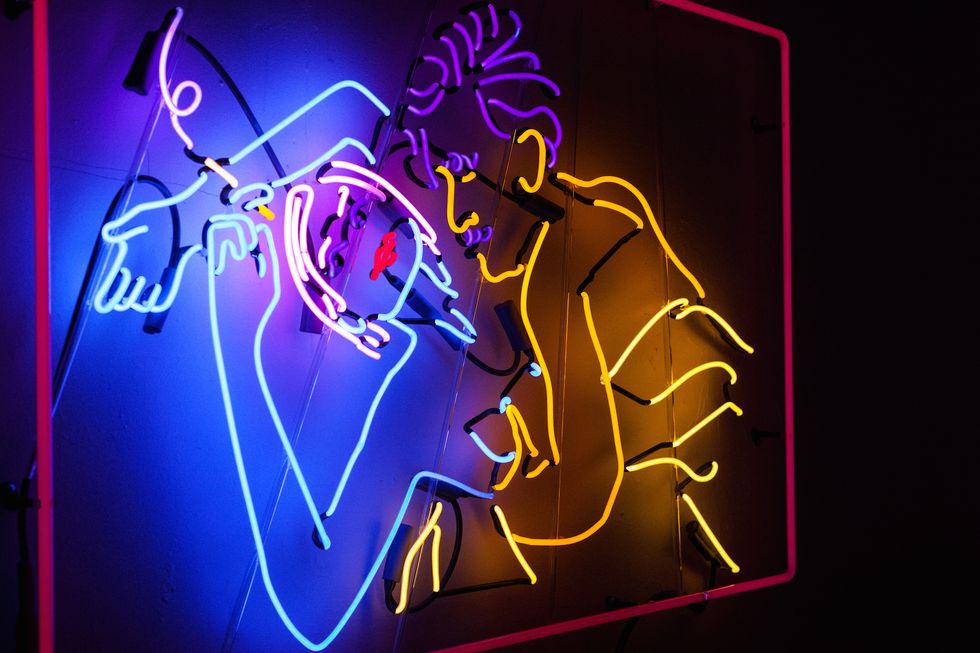 The funny thing about neon is when you're in the process of making it, if you get a crack in the glass or it breaks, it's not like painting or drawing when you can just erase it or go back over it. You have to start all over again. So some can take a day, and some can take weeks. It's a team effort; It's really hard to do alone, you have to have people help you bend, help you pump it, help you paint it— the painting [creates] the parts you don't want lit up. That's basically me sitting at a table for hours with a tiny paintbrush painting out the sections of glass I don't want lit up.
