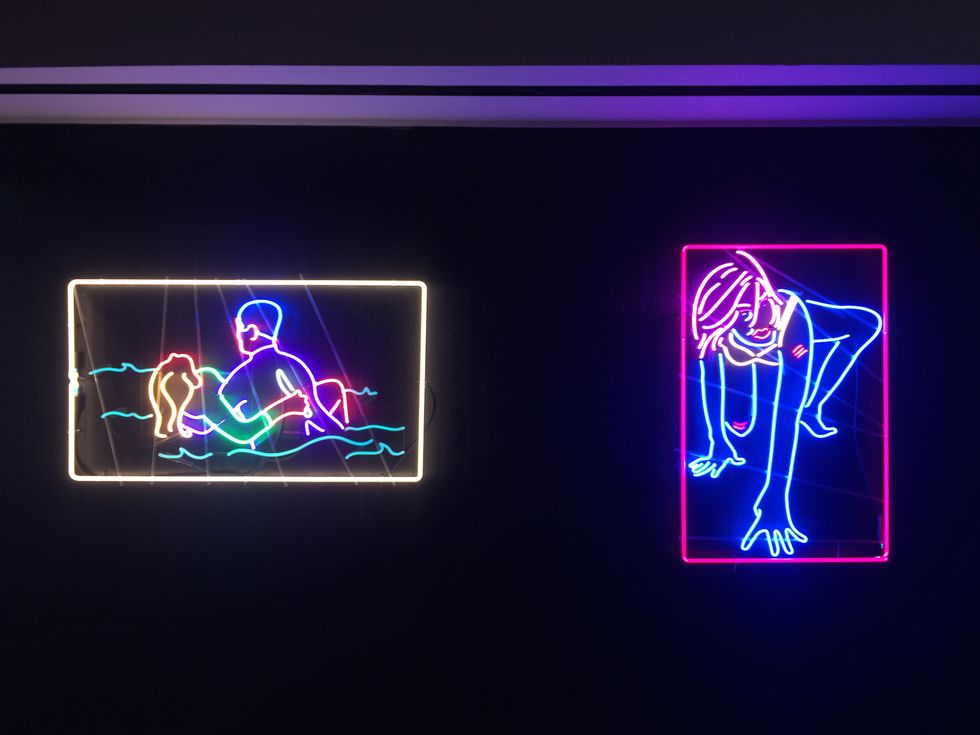 While some people are breaking glass ceilings, others are bending them into their own creation. Take Brooklyn-based artist Kate Hush, who designs and fabricates towering creations made of neon -- forming glass and light into vibrant femme fatales, whether they be strutting their stuff or secretly concealing a knife. You can get a taste of her Times Square meets film noir creations in Female Behavior, her solo show at Cooler Gallery, an art space within a repurposed industrial icebox outside the Brooklyn Navy Yard.