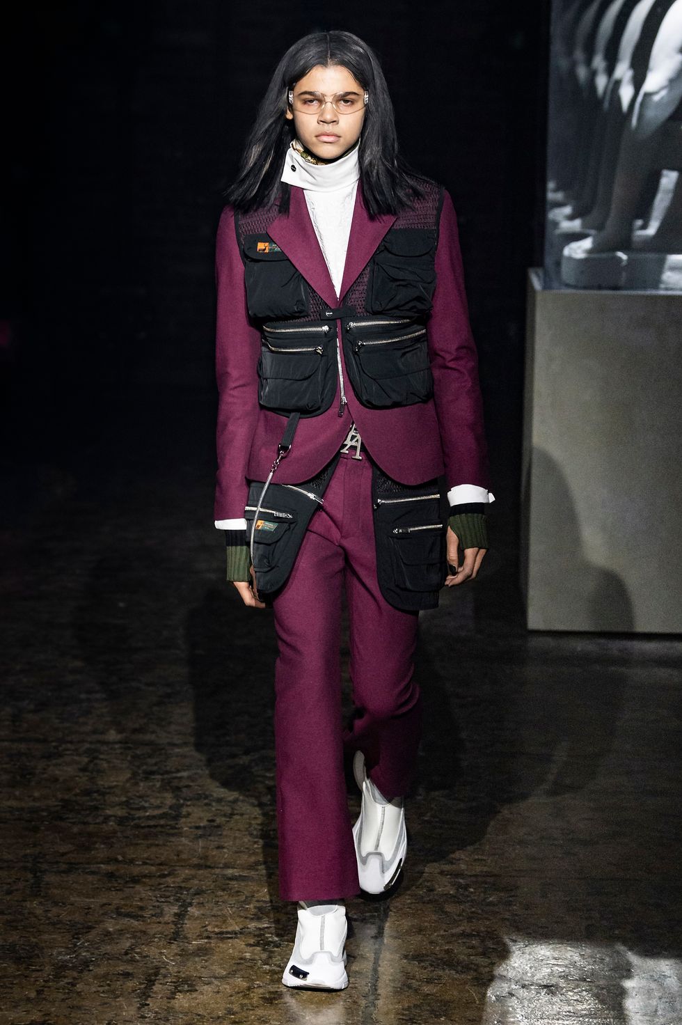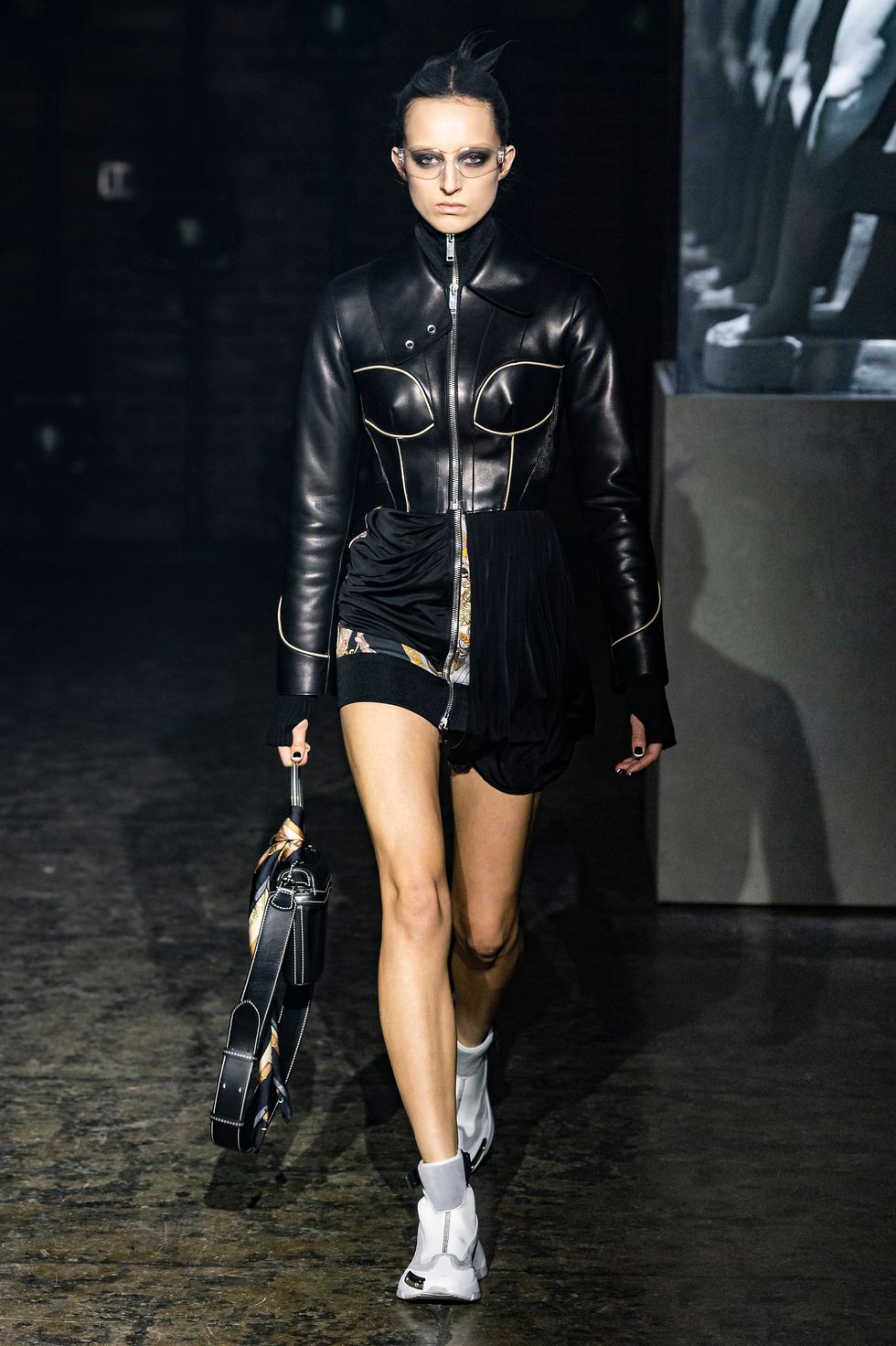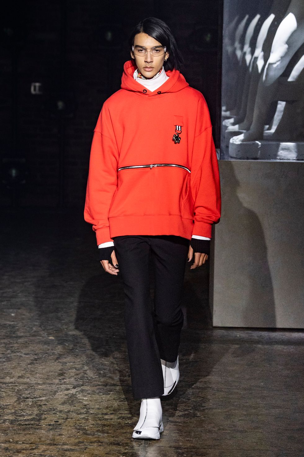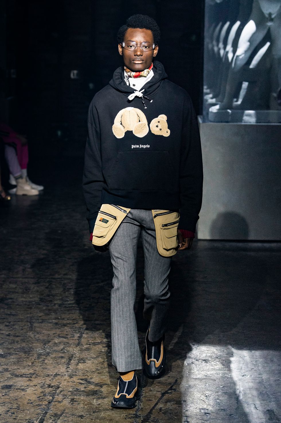 Palm Angels, the Italian fashion brand led by Francesco Ragazzi, made its NYFW debut on Saturday. On a runway illuminated by a pulsing strobe light show and decked with a collection of imitated Grecian statues propped inside clear glass cubes, Ragazzi showcased a sleeker version of his creative ambitions. The brand's fall 2019 collection strayed away from the branded tracksuits and loose-fitting streetwear for which they're known. Instead, Ragazzi sent tailored leather and utilitarian motifs down the runway, signaling a notable shift towards sartorial elegance.