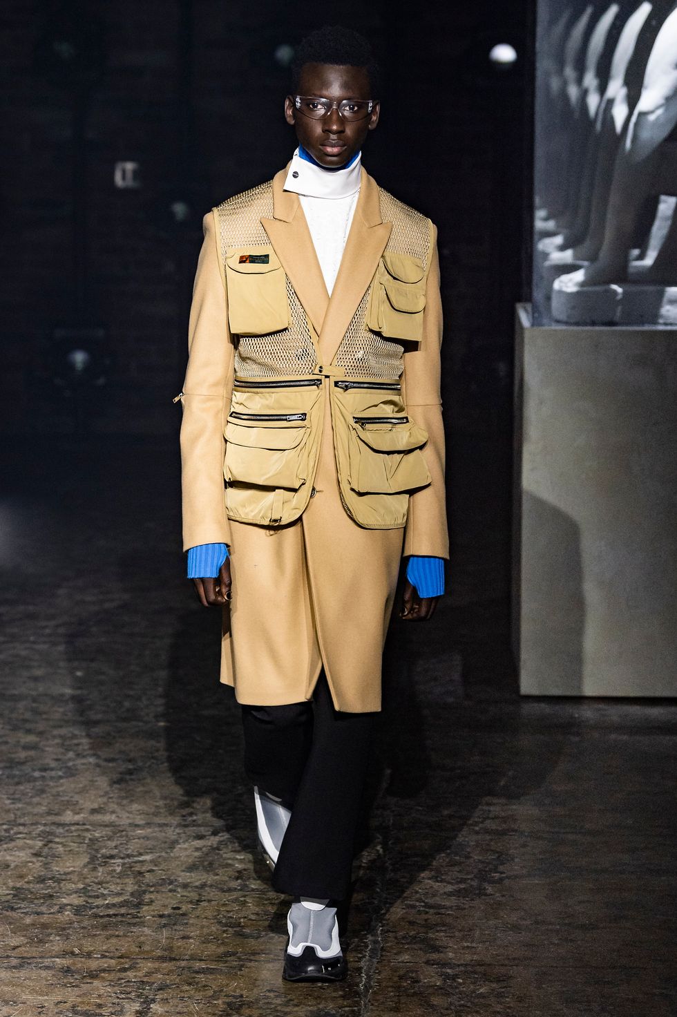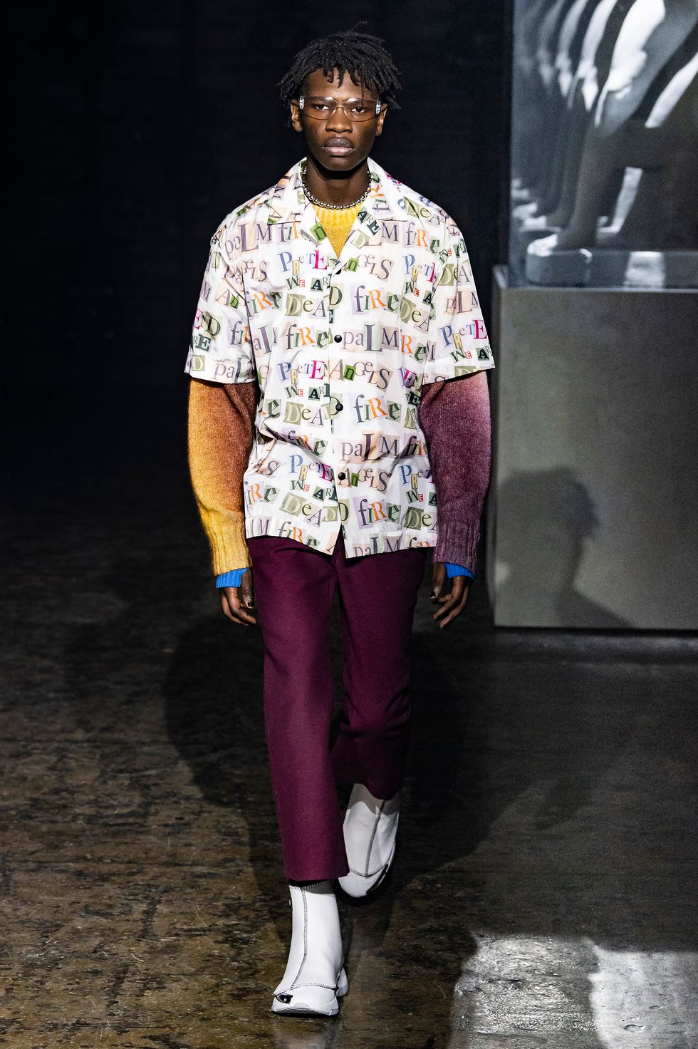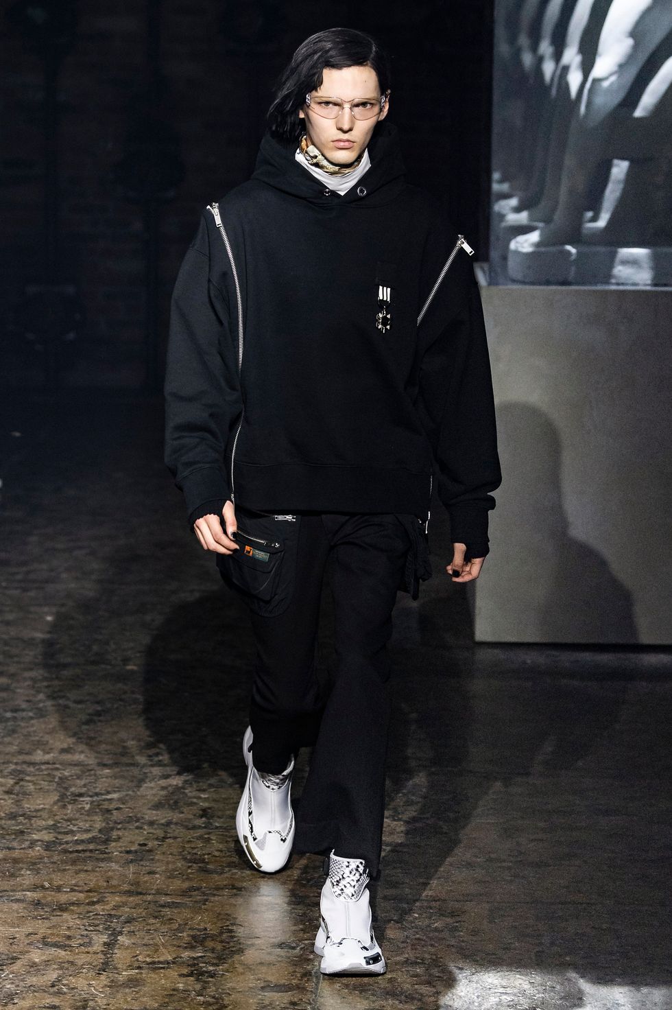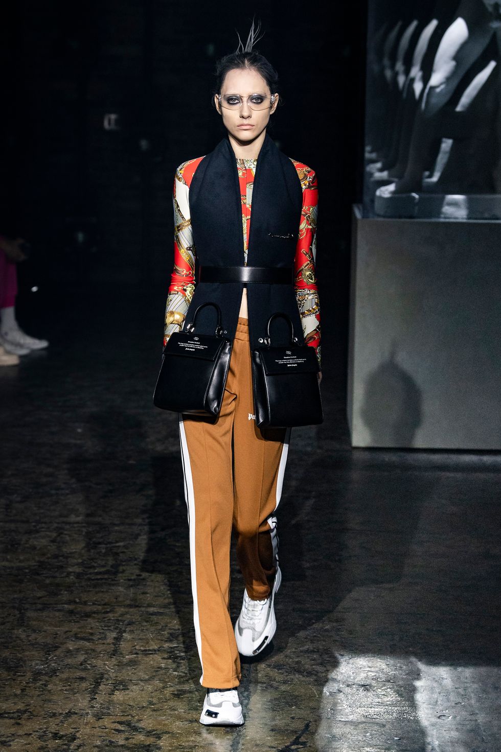 Palm Angels, the Italian fashion brand led by Francesco Ragazzi, made its NYFW debut on Saturday. On a runway illuminated by a pulsing strobe light show and decked with a collection of imitated Grecian statues propped inside clear glass cubes, Ragazzi showcased a sleeker version of his creative ambitions. The brand's fall 2019 collection strayed away from the branded tracksuits and loose-fitting streetwear for which they're known. Instead, Ragazzi sent tailored leather and utilitarian motifs down the runway, signaling a notable shift towards sartorial elegance.