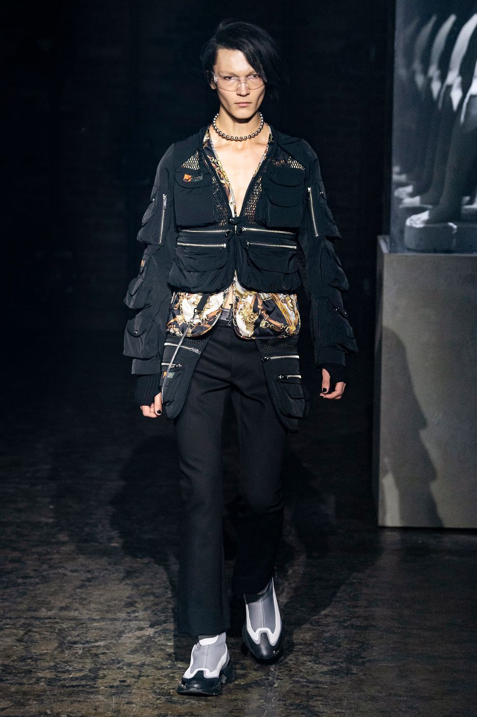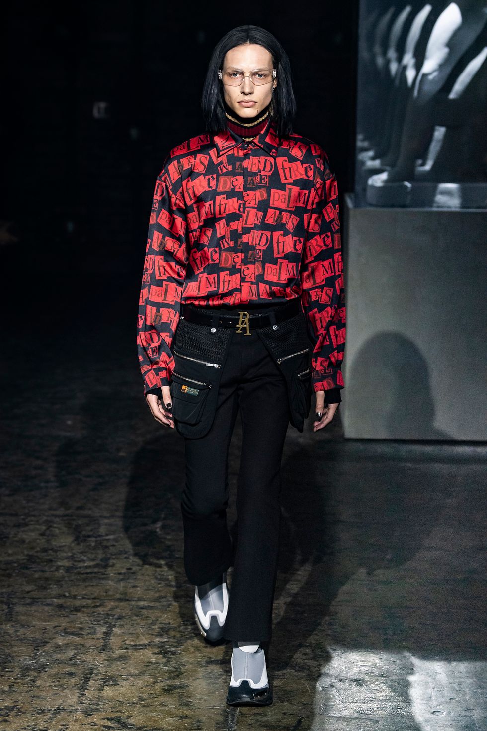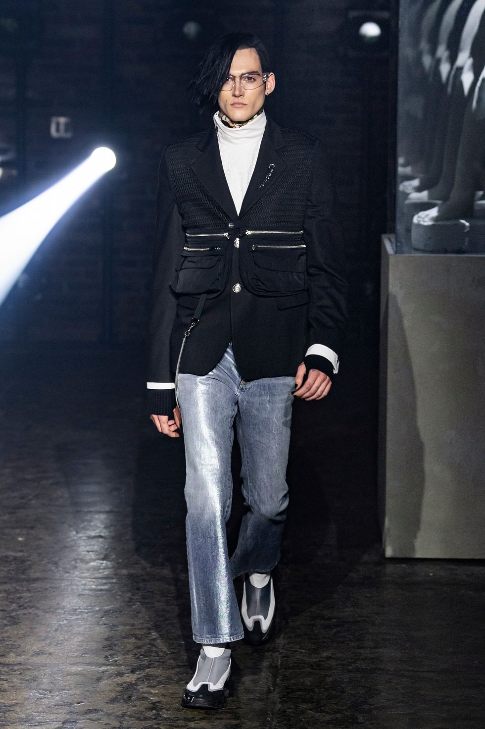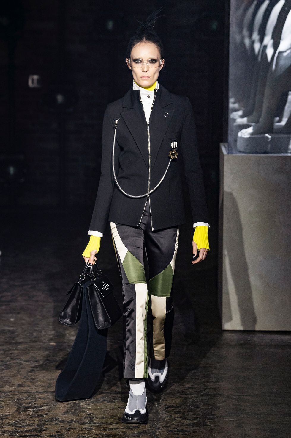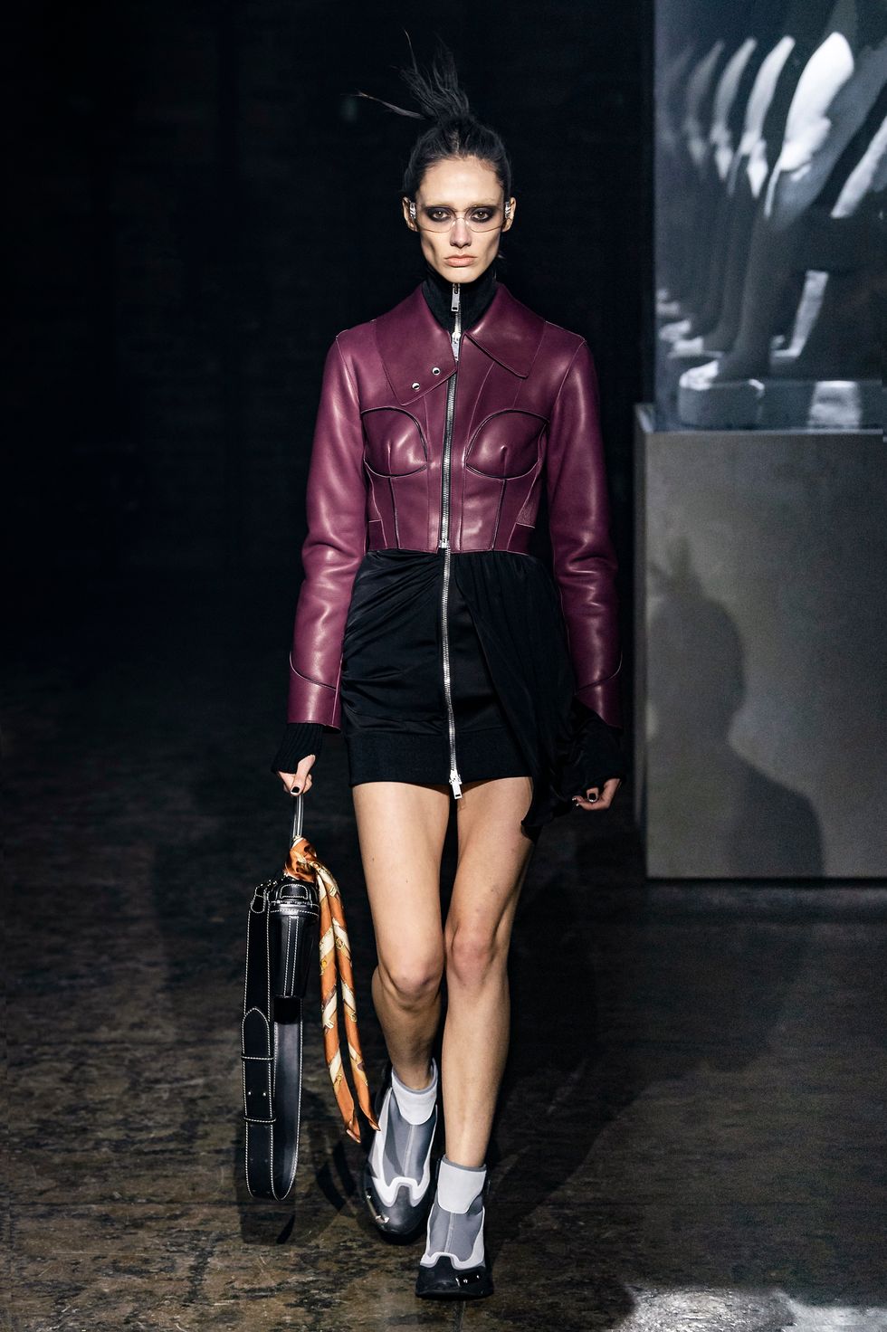 Palm Angels, the Italian fashion brand led by Francesco Ragazzi, made its NYFW debut on Saturday. On a runway illuminated by a pulsing strobe light show and decked with a collection of imitated Grecian statues propped inside clear glass cubes, Ragazzi showcased a sleeker version of his creative ambitions. The brand's fall 2019 collection strayed away from the branded tracksuits and loose-fitting streetwear for which they're known. Instead, Ragazzi sent tailored leather and utilitarian motifs down the runway, signaling a notable shift towards sartorial elegance.
