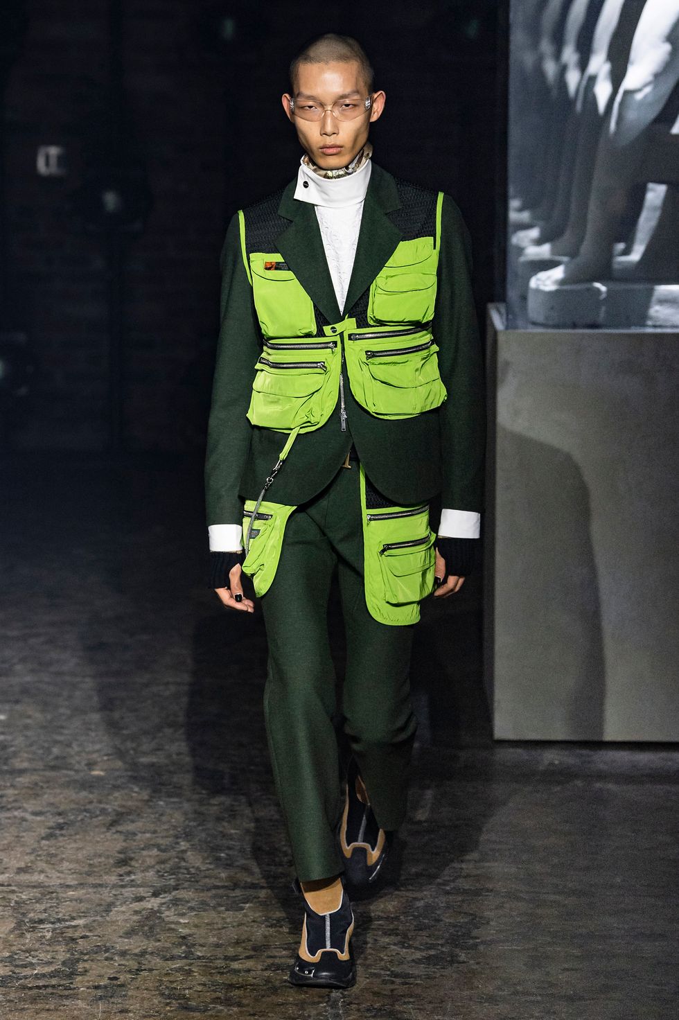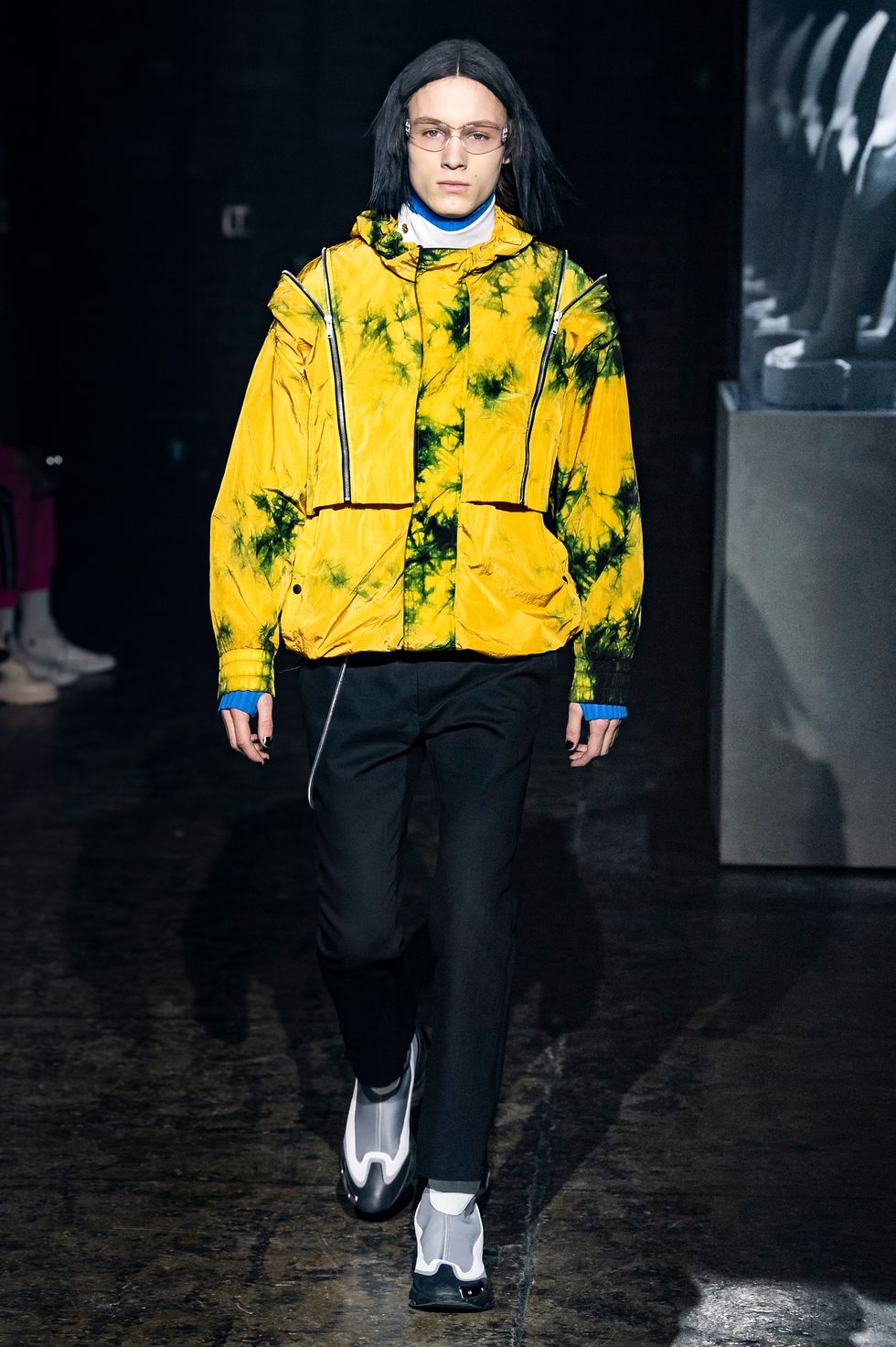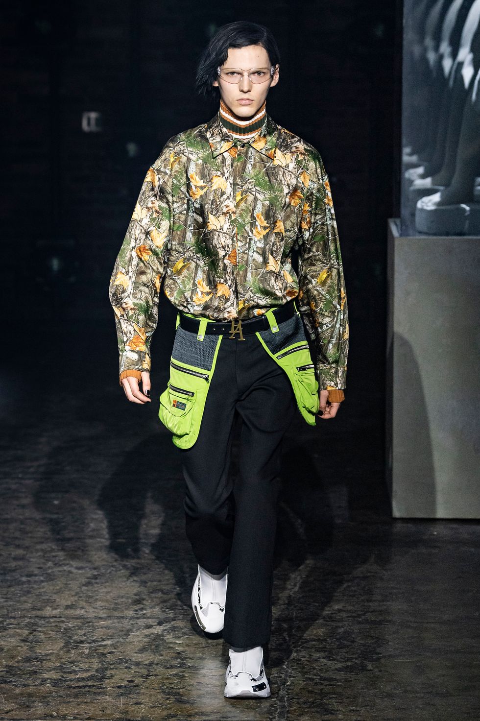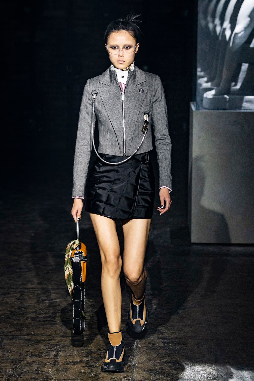 Palm Angels, the Italian fashion brand led by Francesco Ragazzi, made its NYFW debut on Saturday. On a runway illuminated by a pulsing strobe light show and decked with a collection of imitated Grecian statues propped inside clear glass cubes, Ragazzi showcased a sleeker version of his creative ambitions. The brand's fall 2019 collection strayed away from the branded tracksuits and loose-fitting streetwear for which they're known. Instead, Ragazzi sent tailored leather and utilitarian motifs down the runway, signaling a notable shift towards sartorial elegance.