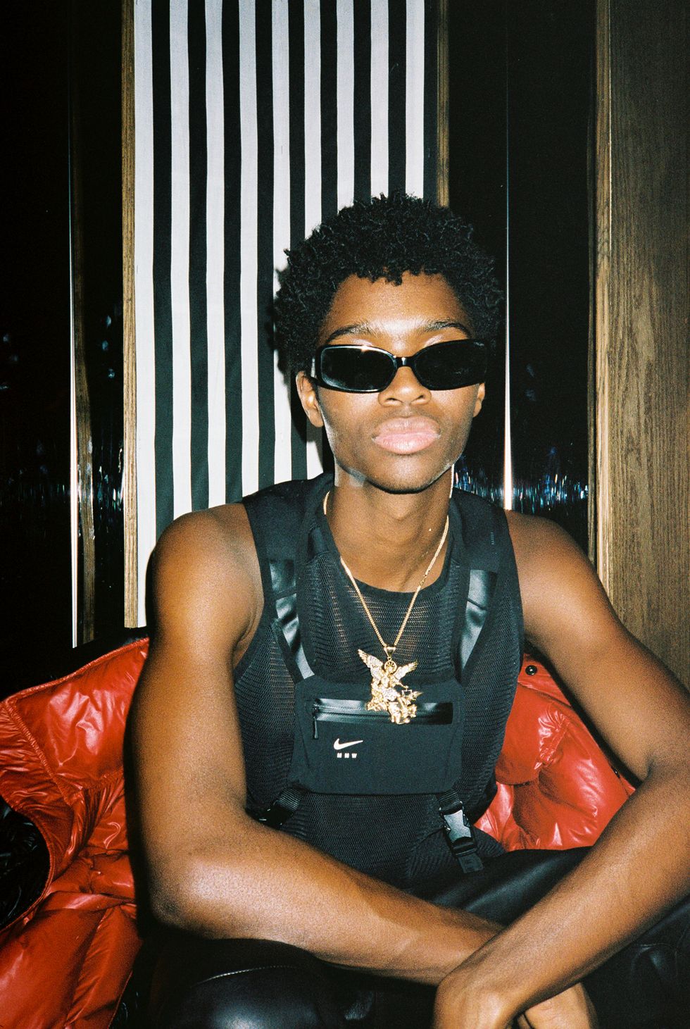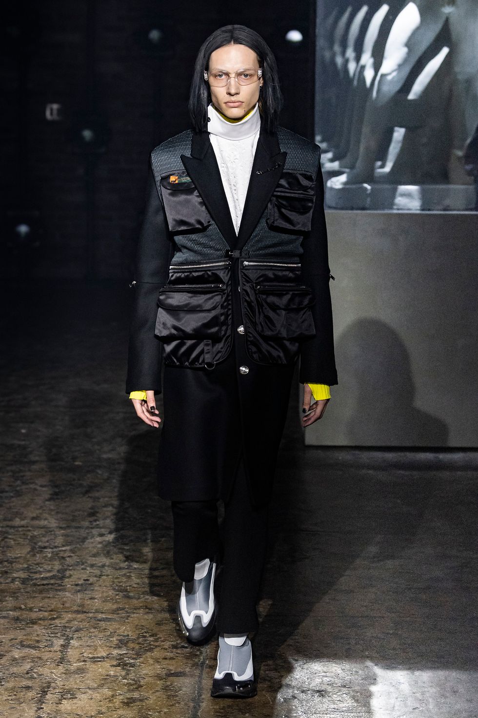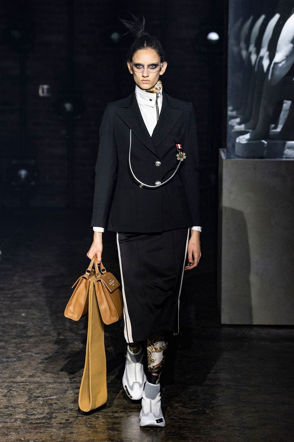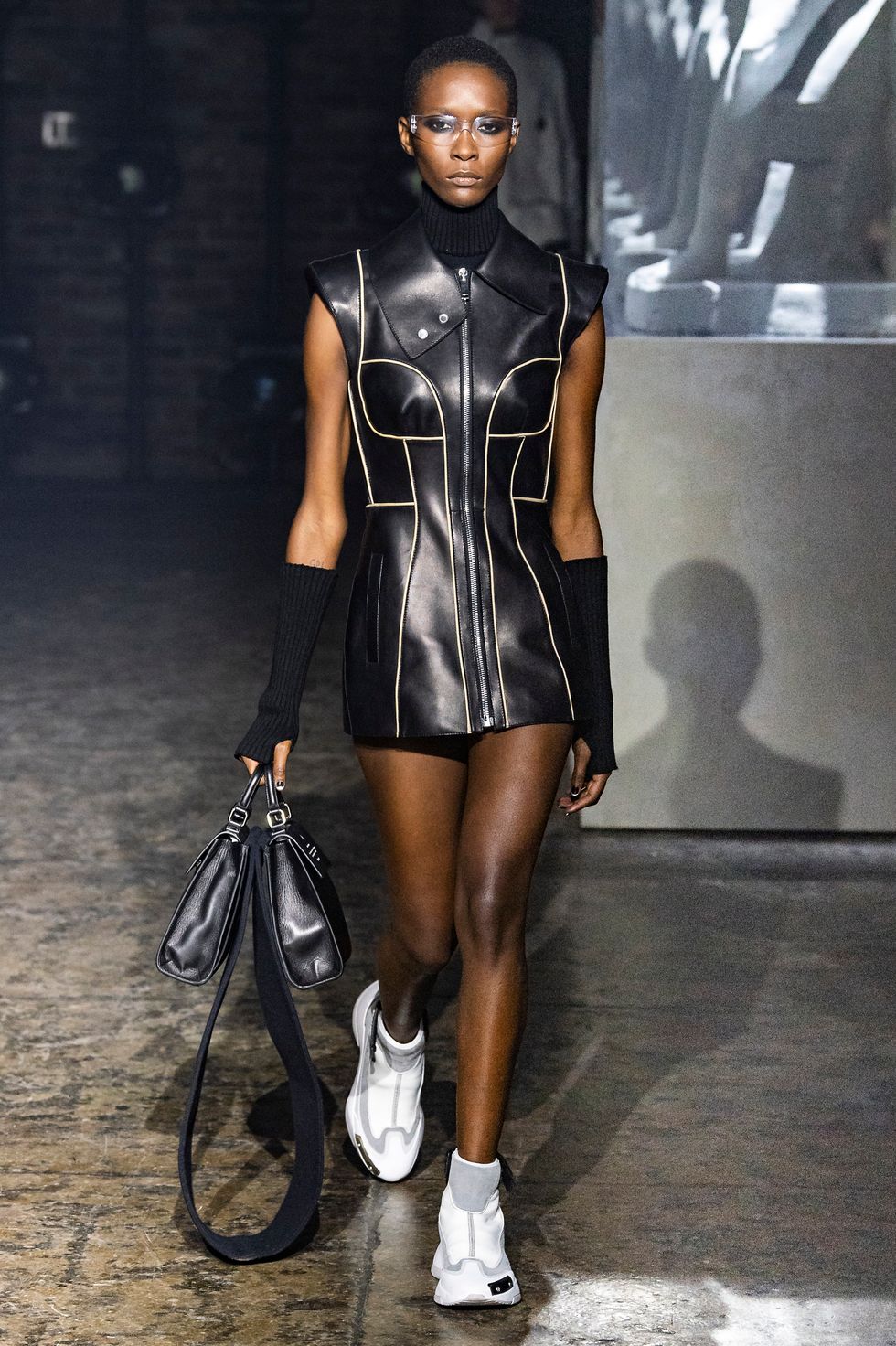 Palm Angels, the Italian fashion brand led by Francesco Ragazzi, made its NYFW debut on Saturday. On a runway illuminated by a pulsing strobe light show and decked with a collection of imitated Grecian statues propped inside clear glass cubes, Ragazzi showcased a sleeker version of his creative ambitions. The brand's fall 2019 collection strayed away from the branded tracksuits and loose-fitting streetwear for which they're known. Instead, Ragazzi sent tailored leather and utilitarian motifs down the runway, signaling a notable shift towards sartorial elegance.