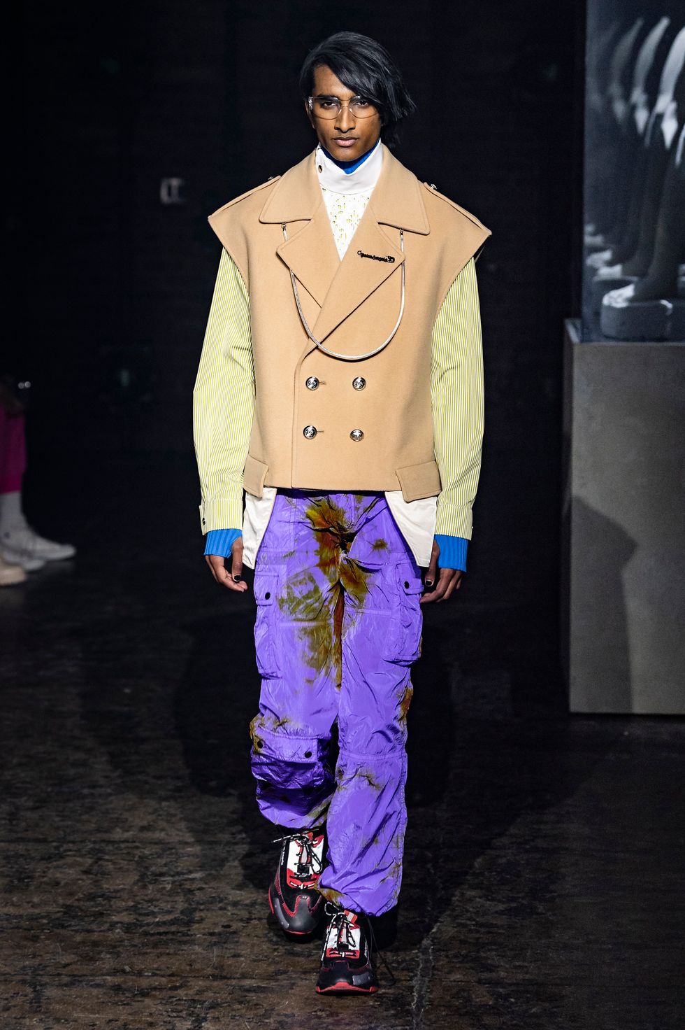 The collection drew inspiration from classic uniforms while integrating the utilitarian pockets and camouflage print often seen on hunting and fishing outerwear. As a visual juxtaposition, the designer also incorporated pocket chains and cutoff blazers into the lineup, infusing a punk iteration into classic menswear references. The women's pieces cohesively trotted along the same aesthetic line. In addition to the referential use of beige, Ragazzi included bright colored pants, light textiles and tie-dye hoodies into the centrally dark color scheme.