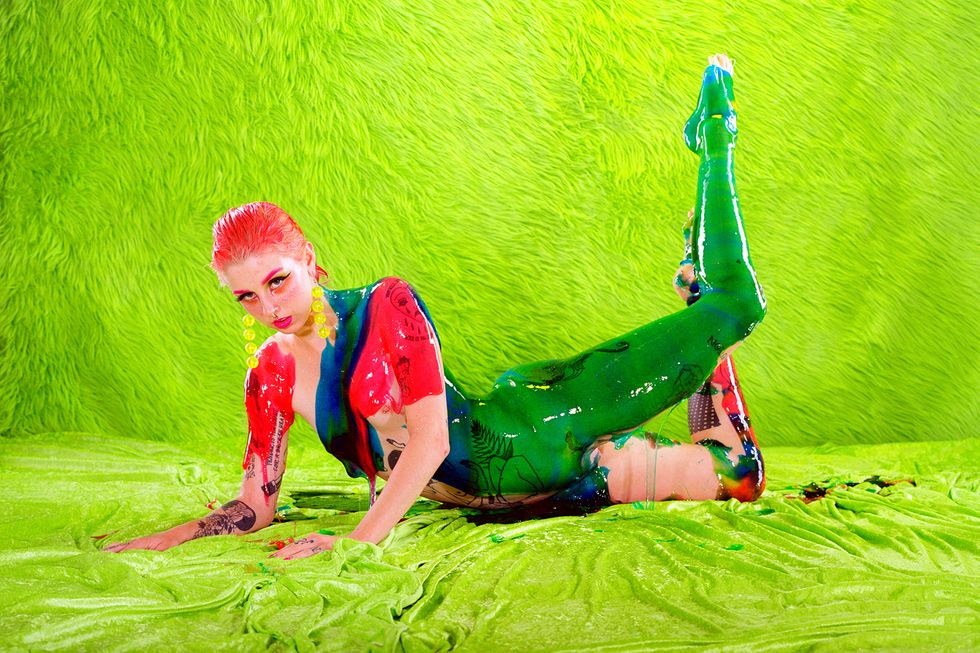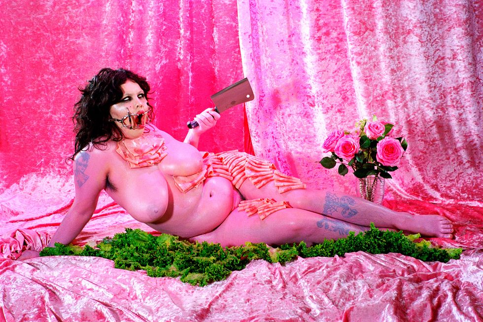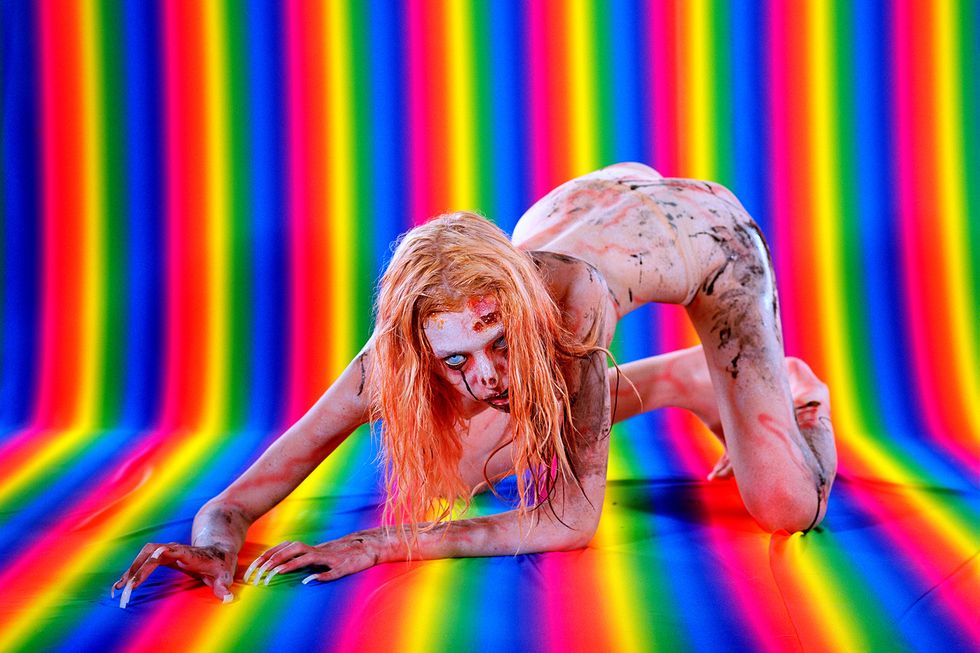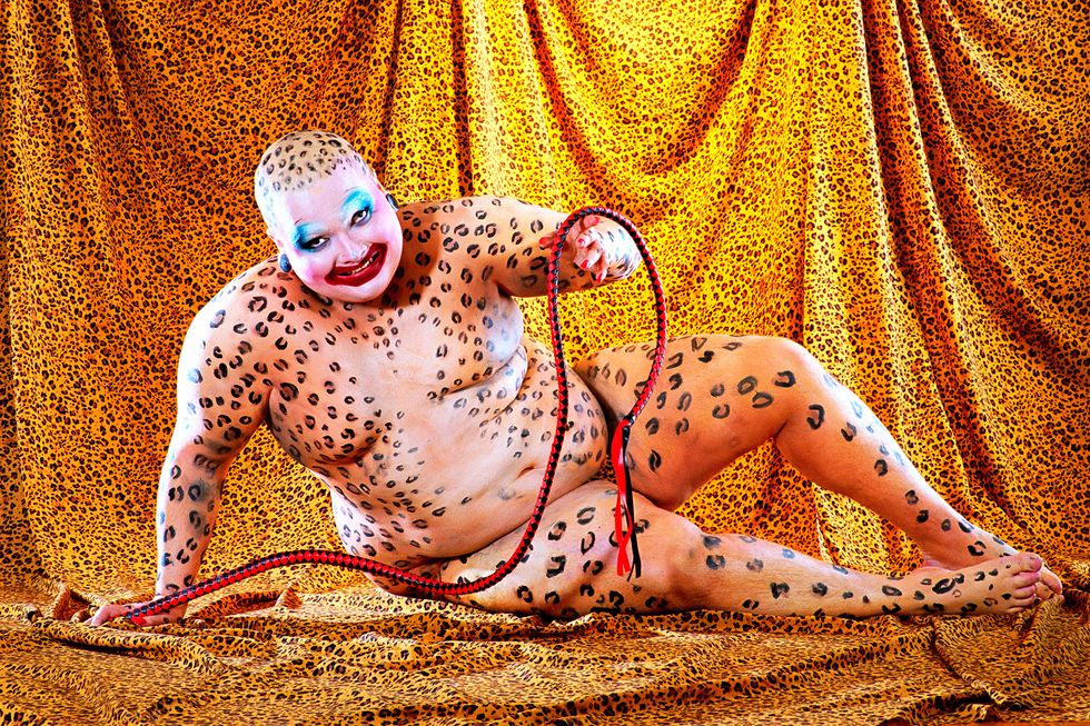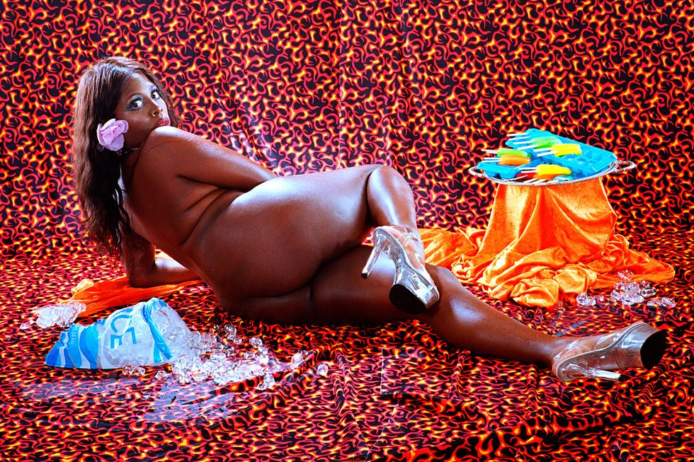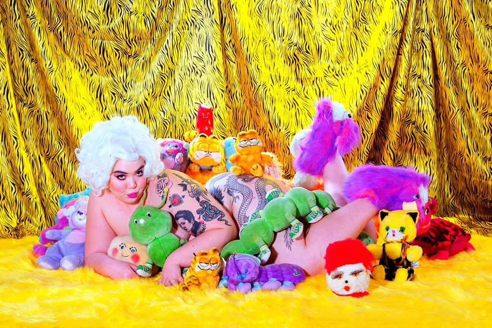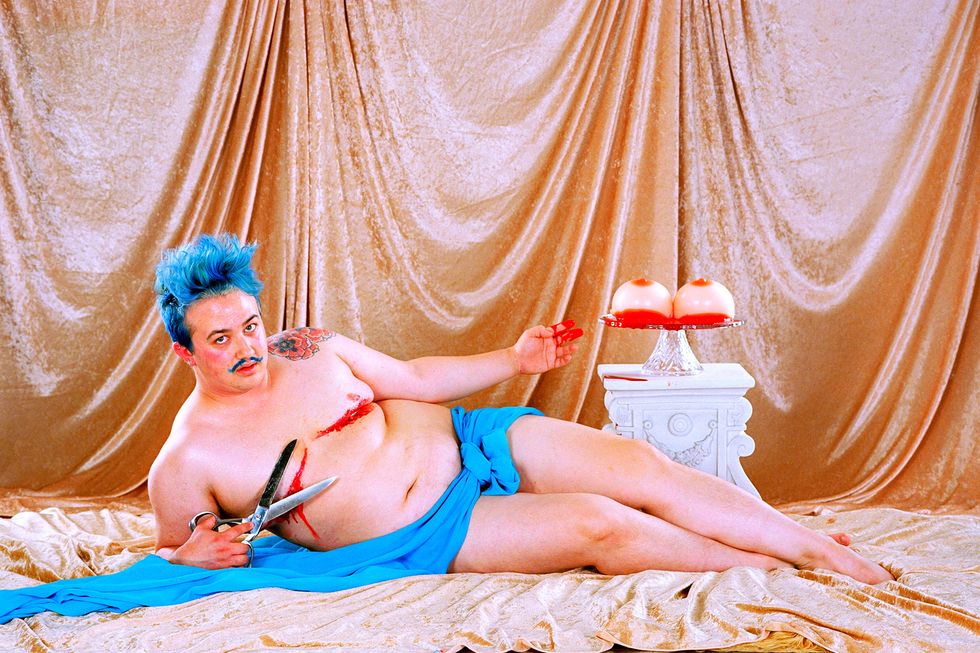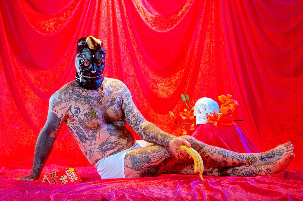 Day's newest exhibition, Possession, builds on the work of her previous show by expanding her lens to the whole body. It explores what it means to first and foremost inhabit a body and in what ways all bodies are simultaneously similar and vastly different. With each portrait in the series embodying a singular concept like "Decay," "Love," or "Surgery," Day uses her subjects' nude forms as a canvas to build on and draws on drag aesthetics and surrealist imagery to ultimately achieve that goal. The end result is a vibrant and playful lexicon of Day's own design.