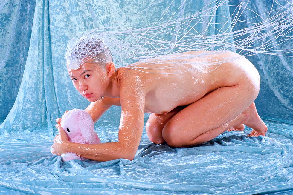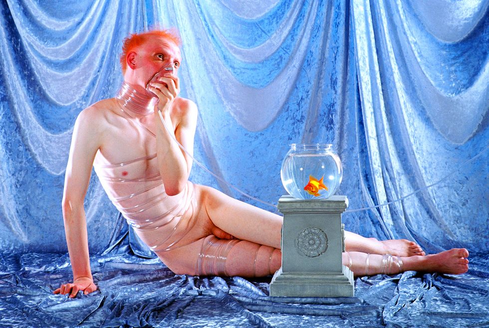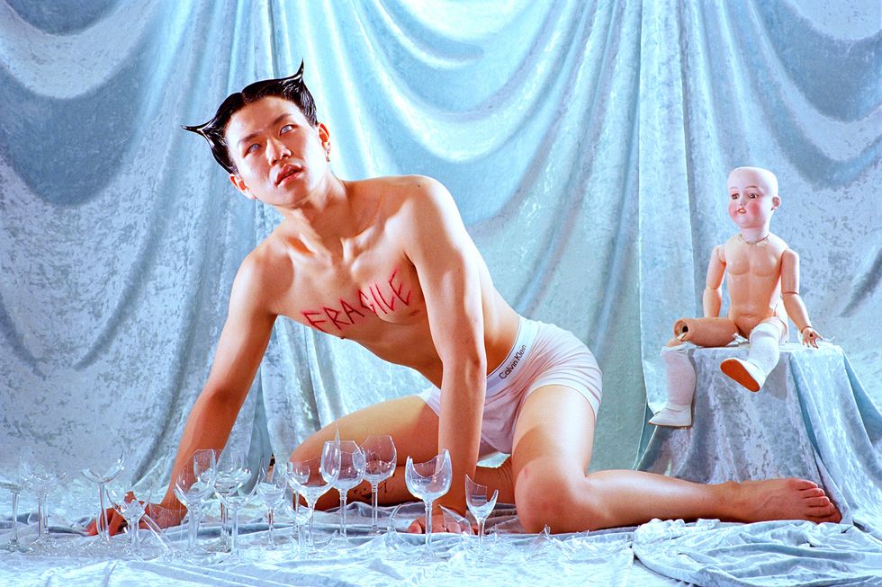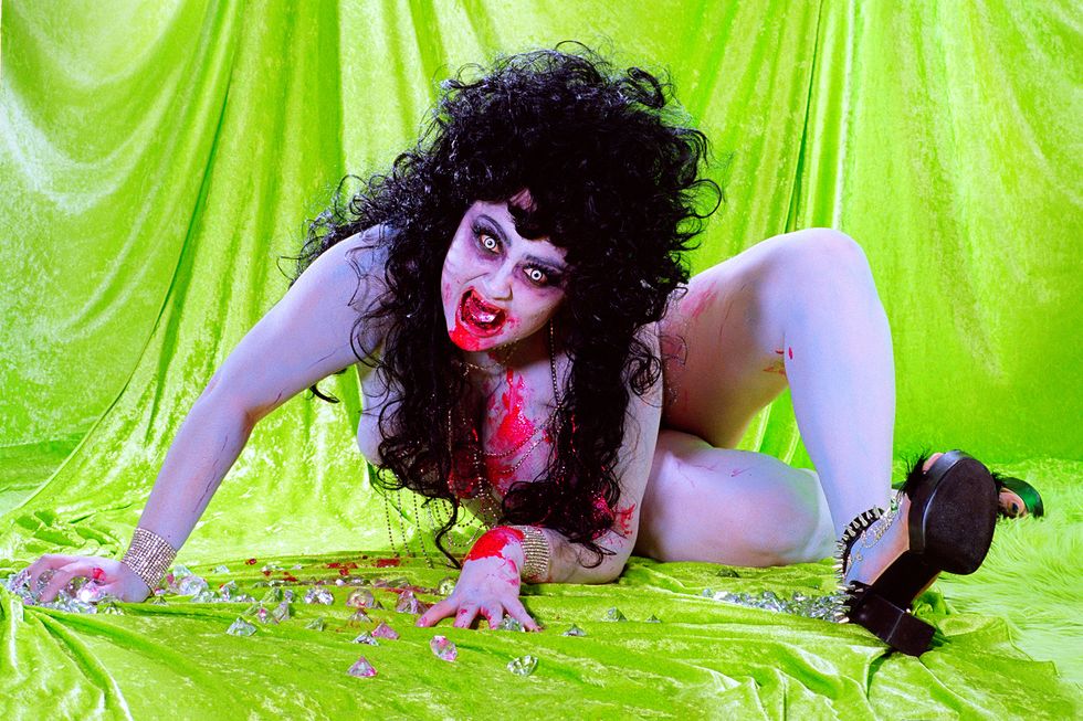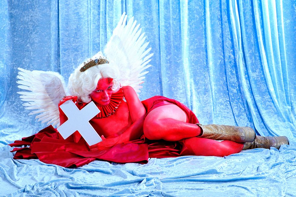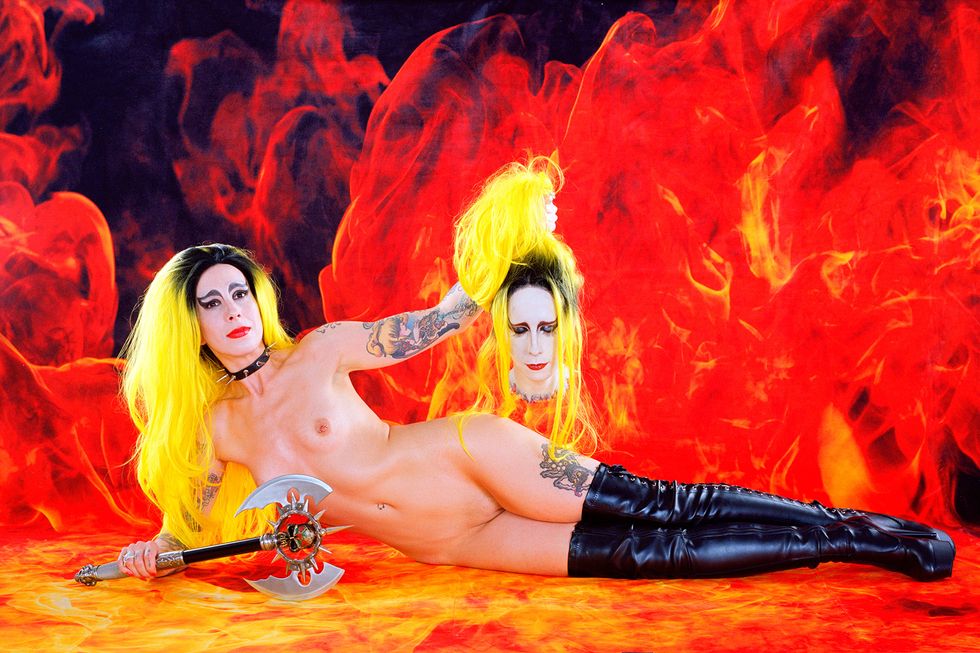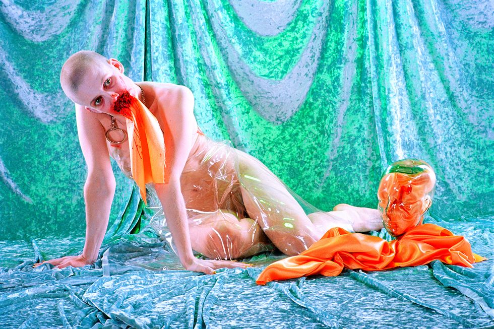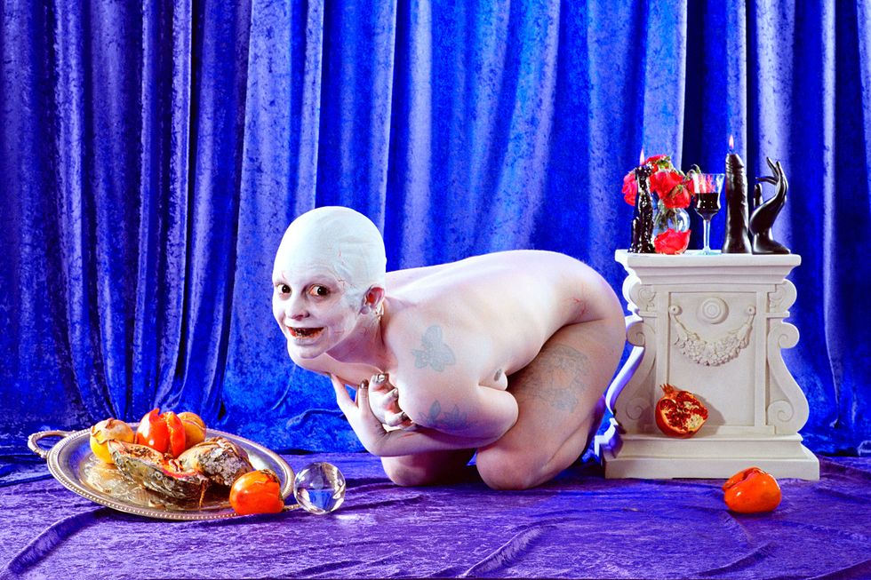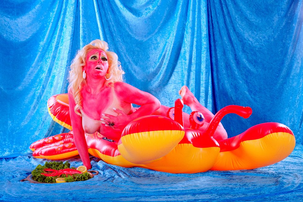 Day's newest exhibition, Possession, builds on the work of her previous show by expanding her lens to the whole body. It explores what it means to first and foremost inhabit a body and in what ways all bodies are simultaneously similar and vastly different. With each portrait in the series embodying a singular concept like "Decay," "Love," or "Surgery," Day uses her subjects' nude forms as a canvas to build on and draws on drag aesthetics and surrealist imagery to ultimately achieve that goal. The end result is a vibrant and playful lexicon of Day's own design.