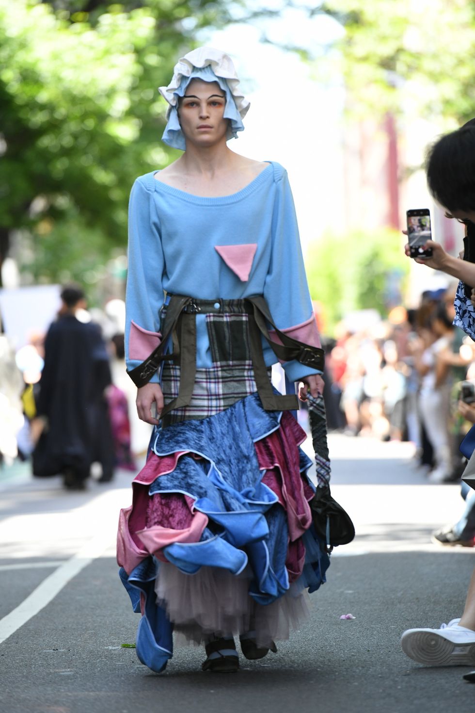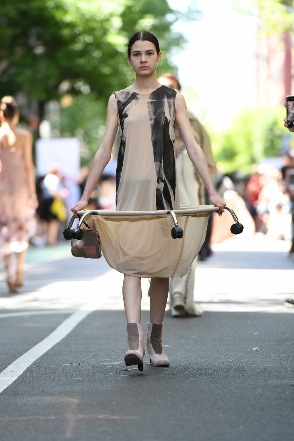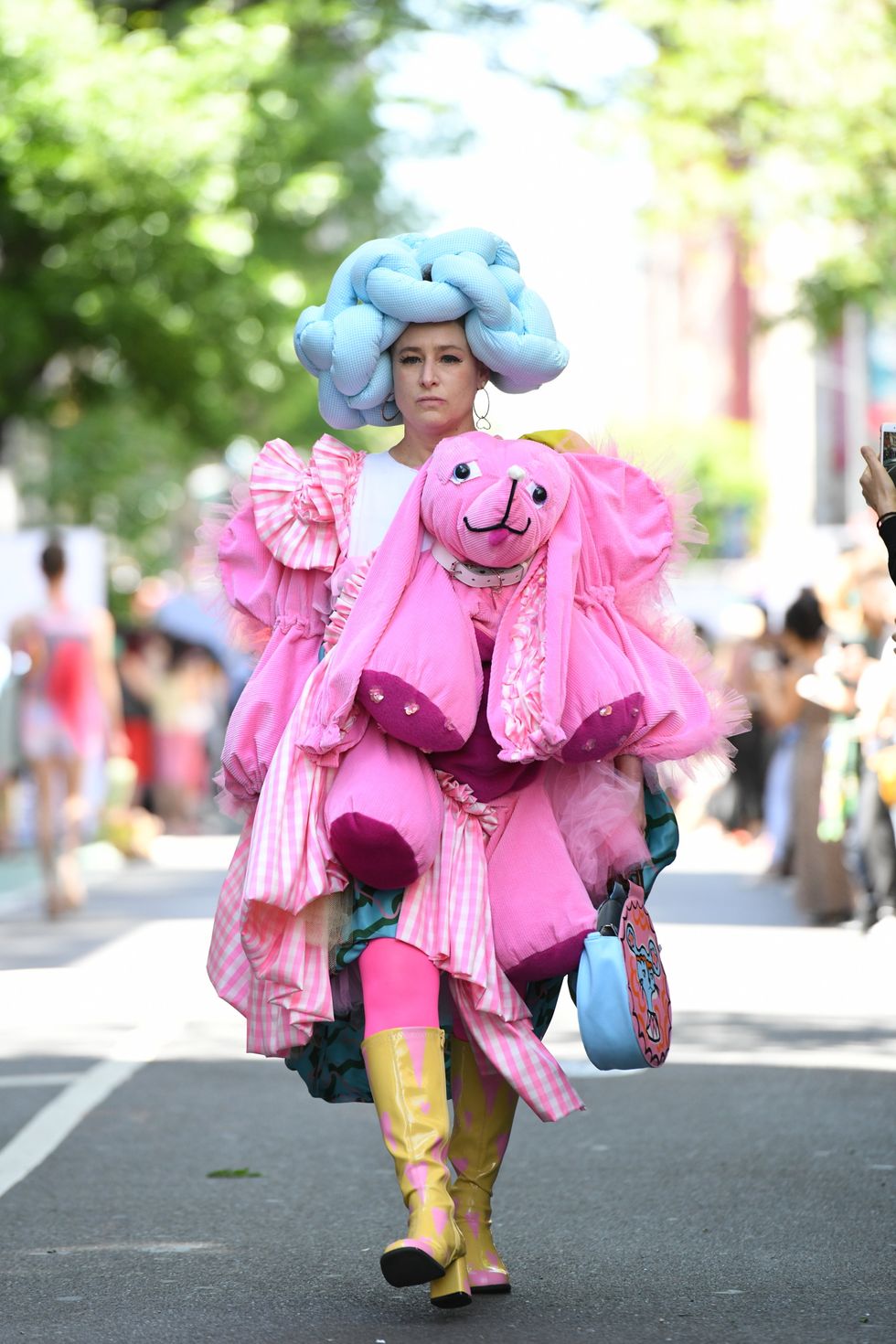 Among the hundreds of looks were a few standout pieces: Megan O'Cain envisioned a childlike fantasy, attaching an oversized hot pink stuffed bunny to the front of her gingham dress; Joyce Ko trimmed the bottom of her sheer nude gown with wheels like the base of an office chair; Jose Luis Cabrera showed three looks, two for actual children with technicolor painted details; Daorui Story Si revived bonnetcore, with a queer interpretation of granny glamour; and Beate Karlsson designed a full bodysuit in the shape of boxy denim jeans.