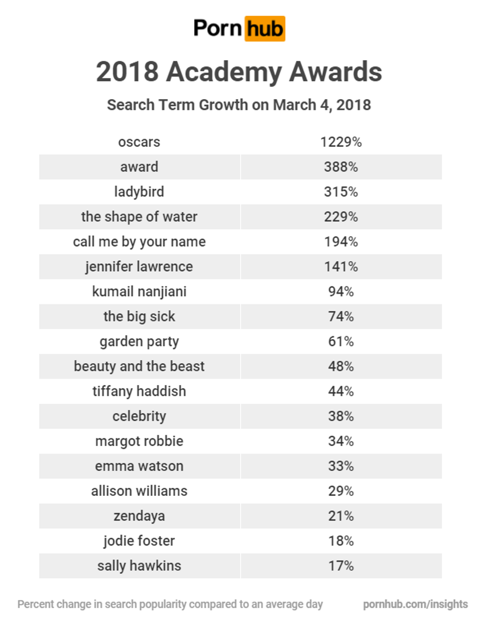 Porn got weird on Sunday night — perhaps even weirder than usual. You see, Sunday night was the 2018 Oscars, and while Pornhub did see a seven percent drop in traffic during their busiest time, they also saw big-time increases in more specific searches.