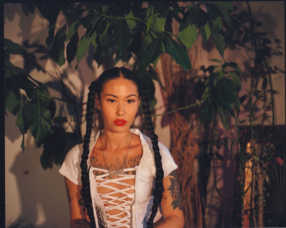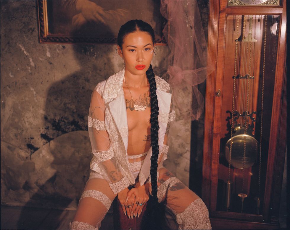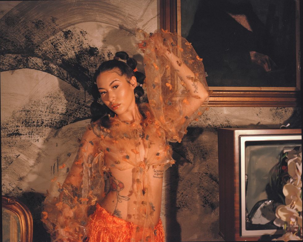 This season, Tia focused her vision on disrupting conventional ideas of what type of women are deserving of elegance and delight. She tapped spiritual advisor, wellness editor and modern day Renaissance woman Emilia Ortiz to model her designs against a vintage-inspired interior space straight out of an 18th century castle. Against dark walls smudged black with paint, a sheer orange blouse and fringed maxi skirt looked vibrant paired with Ortiz's braided pigtails and giant "Brooklyn" tattoo stretched across her chest.