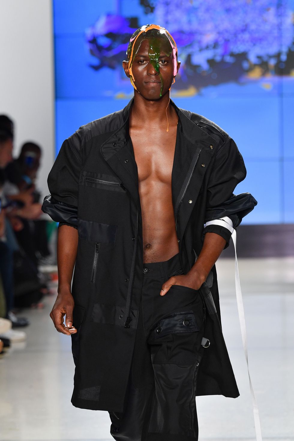 The slime at Landlord intentionally dribbled in a way that felt more Kids' Choice Awards than the goop that kids are actually choosing (as did the slime in PAPER cover star Christina Aguilera's "Accelerate" video). And while this may be the first runway show to feature models covered in actual slime, the trend has been steadily sliding into fashion. Adam Selman's fall 2018 show included t-shirts and slips printed with a graphic of a manicured hand squeezing bright green slime, and Jeremy Scott spring 2017 included slime patterns. Both Garage and French Vogue have created their own high-end slime videos. It's also omnipresent in beauty — snail mucin is widely used in popular Korean beauty products, and painfully hip nail artist and Sally Hansen global color ambassador Madeline Poole released a polish in March called "Slime Scene."