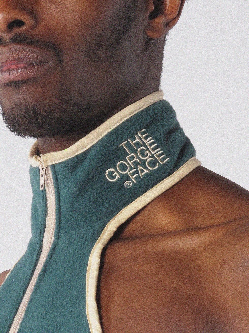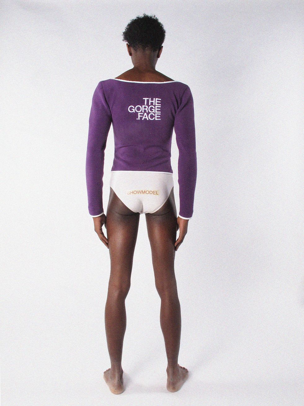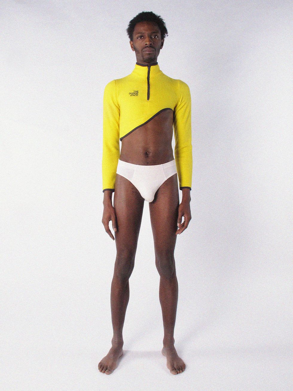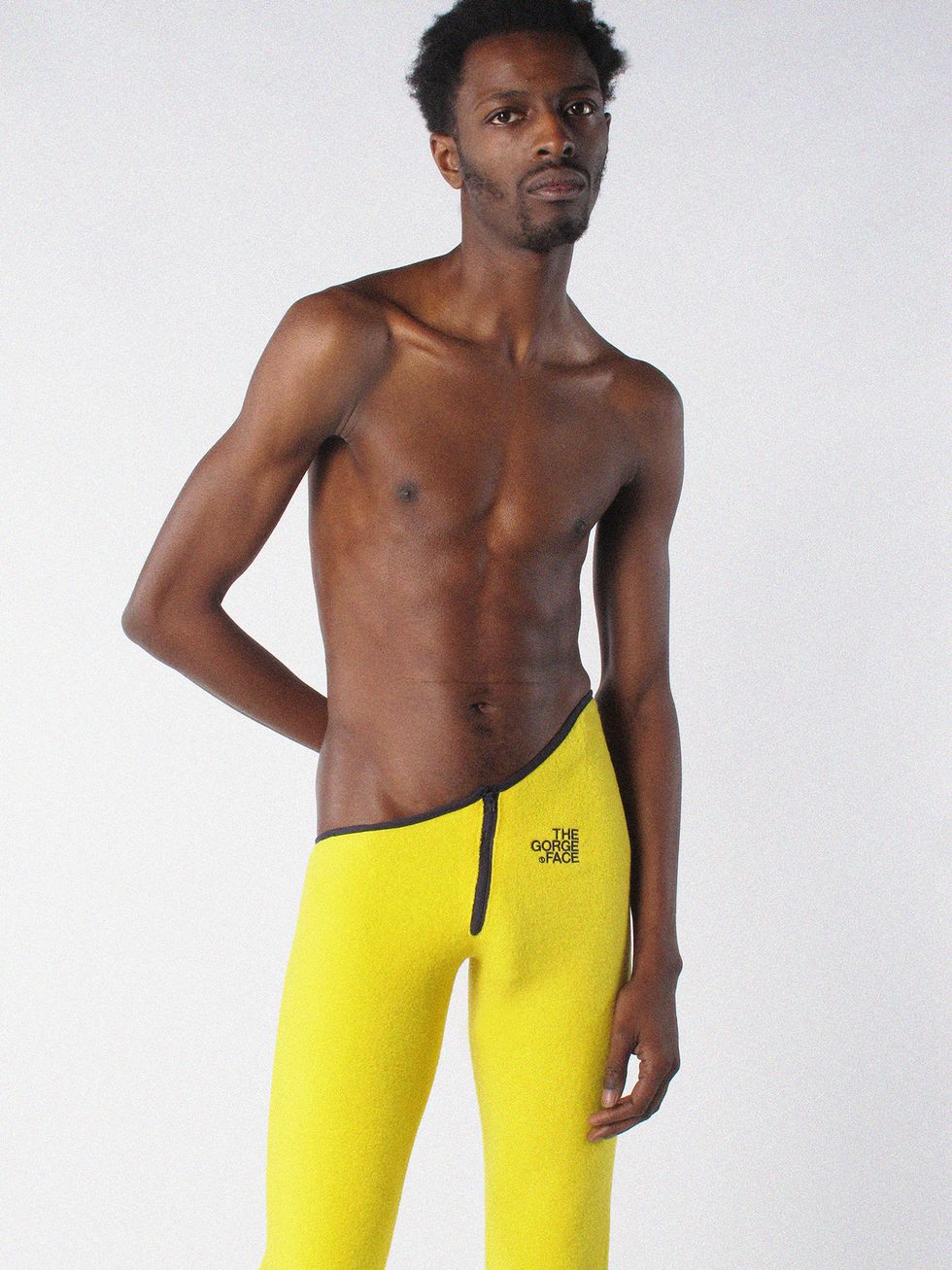 Their collection, titled SHOWMODEL, features a lineup of skin-baring looks, all printed with "The Gorge Face" as fake, tongue-in-cheek branding. By using The North Face as core inspiration, Sassen's intentions were to take everyday, stereotypical pieces, and infuse them with a dose of queer, outsider energy. He designed fleece shorts with the ass completely cut out, skin-tight pants with a waistline that dips far below the hips, bodysuits with asymmetrical sleeves, and matching accessories like gloves or scarves.