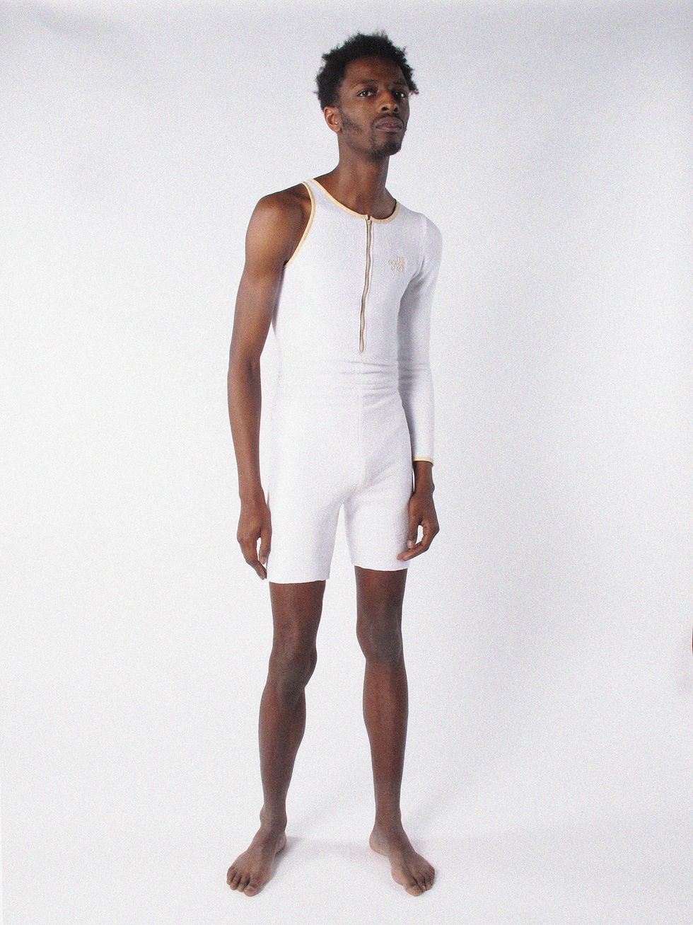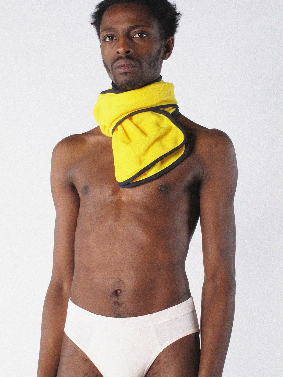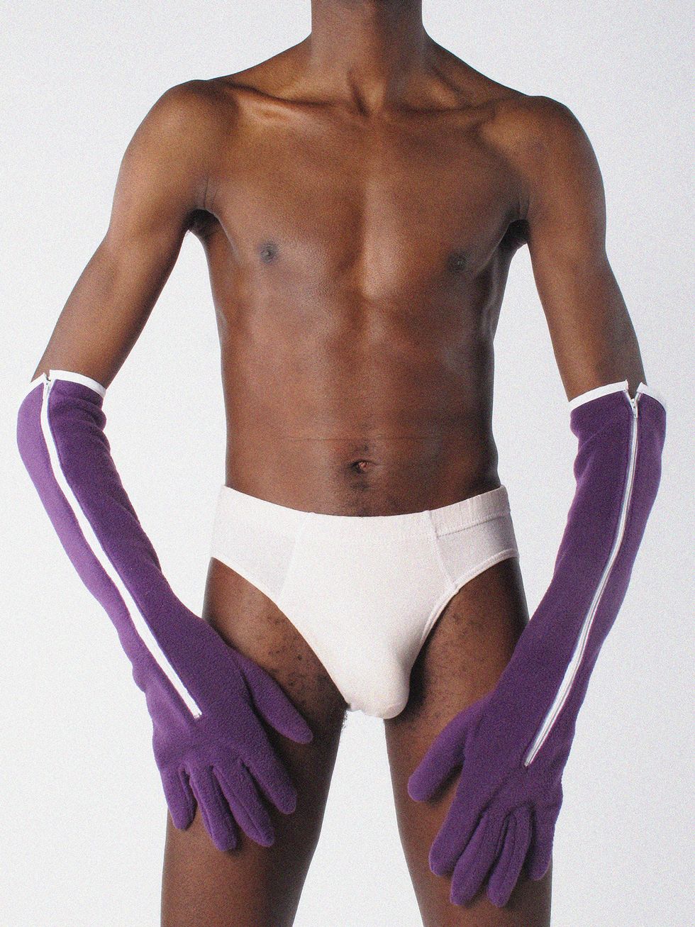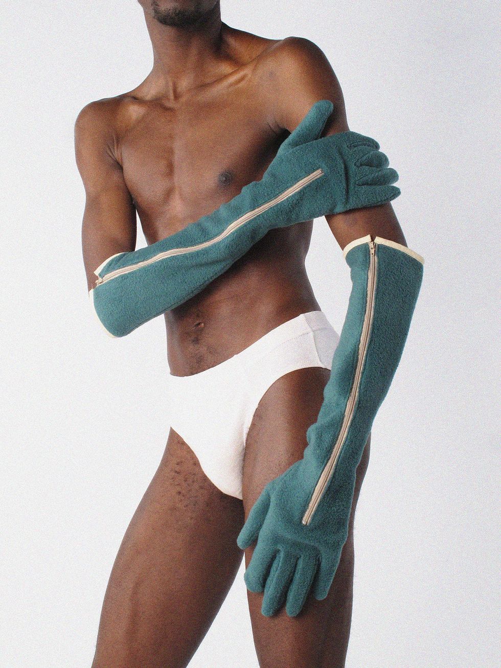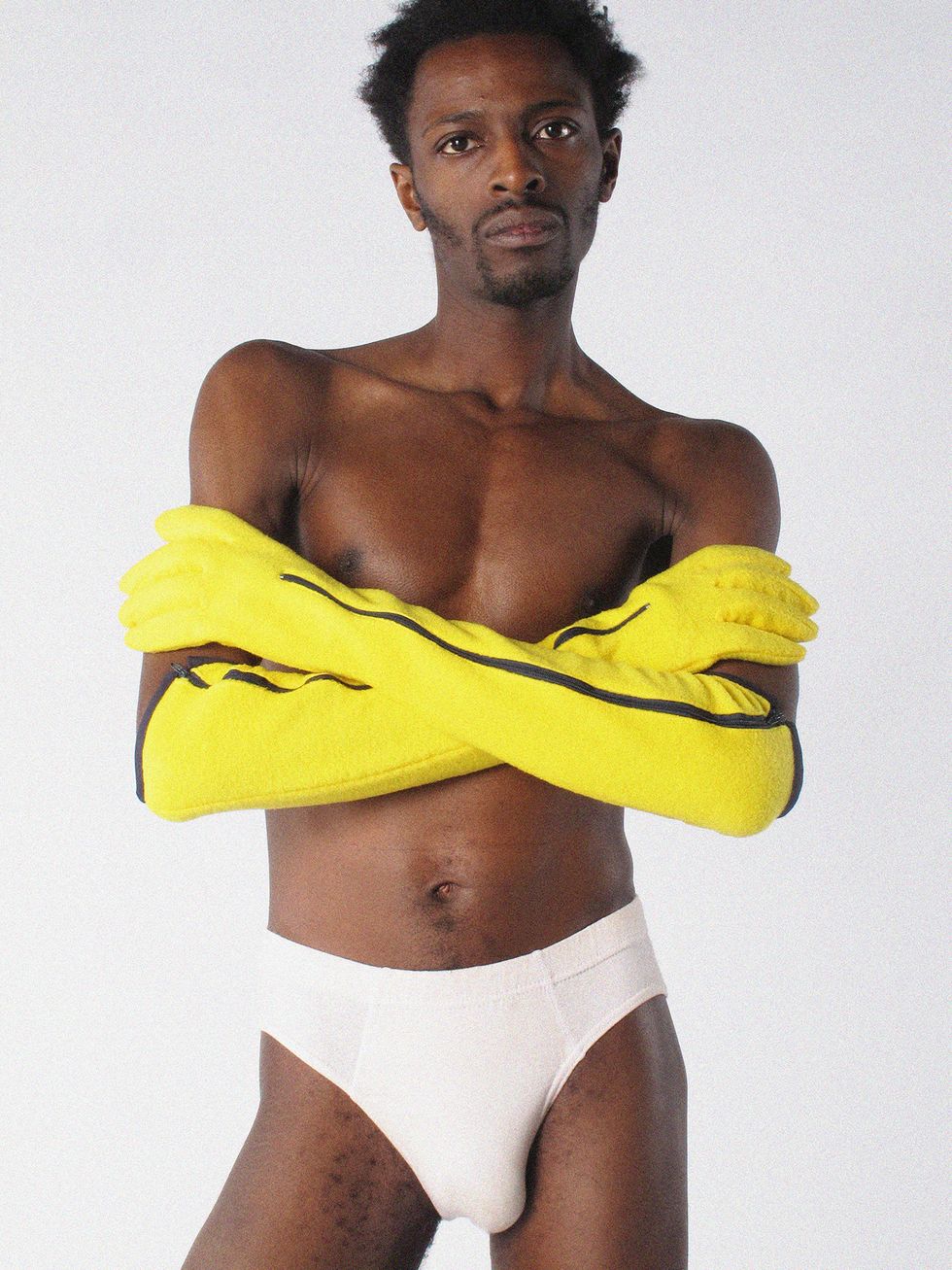 Their collection, titled SHOWMODEL, features a lineup of skin-baring looks, all printed with "The Gorge Face" as fake, tongue-in-cheek branding. By using The North Face as core inspiration, Sassen's intentions were to take everyday, stereotypical pieces, and infuse them with a dose of queer, outsider energy. He designed fleece shorts with the ass completely cut out, skin-tight pants with a waistline that dips far below the hips, bodysuits with asymmetrical sleeves, and matching accessories like gloves or scarves.