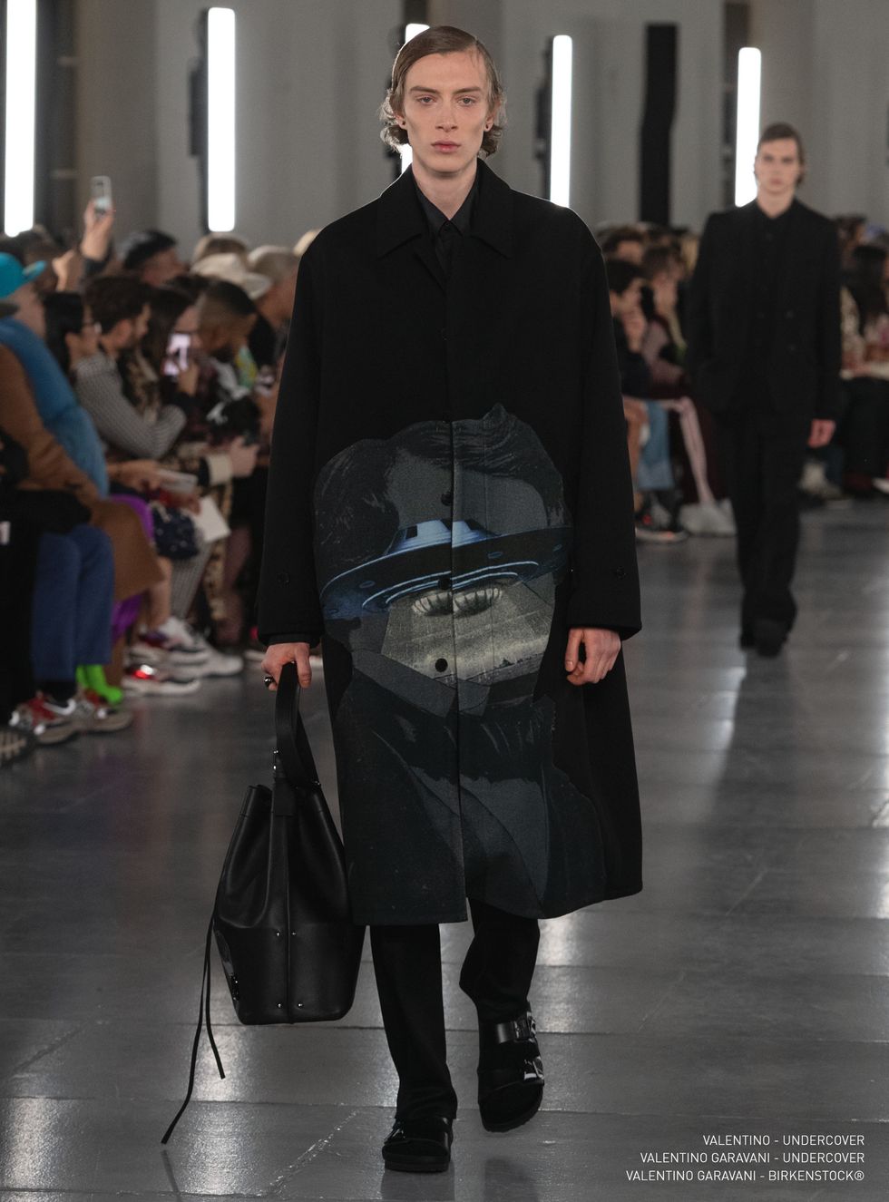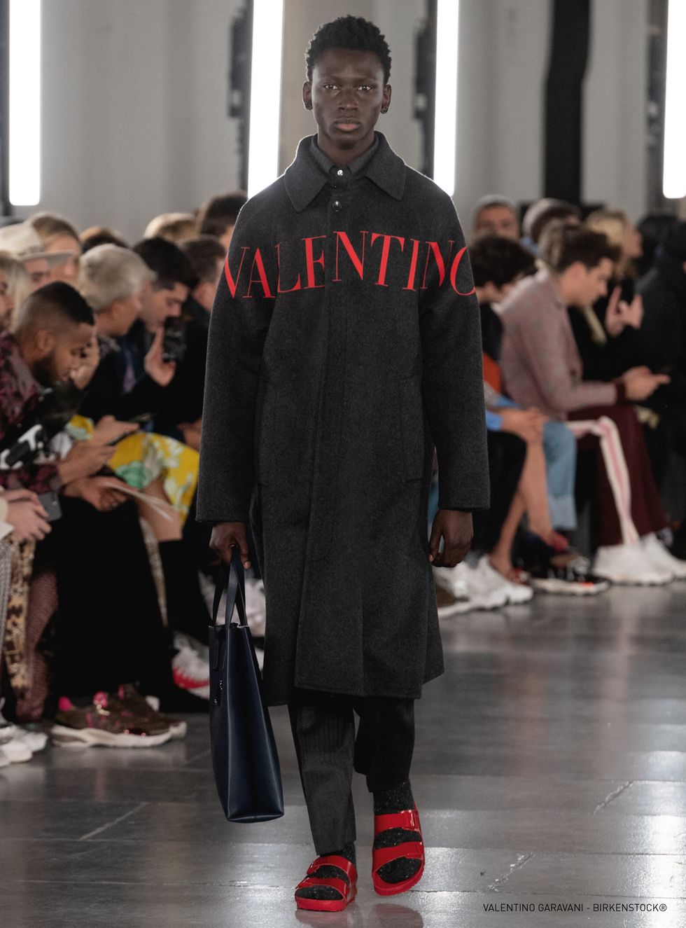 Creative Director Pierpaolo Piccioli, who spearheaded the collaboration between the Italian fashion house and legendary German footwear brand, sent men down the runway looking comfy as hell in socks and sandals paired with tailored slacks, graphic-emblazoned pea coats, and trenches.