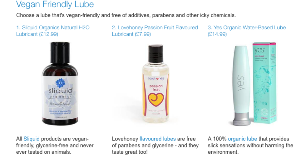 Choosing lubes (edible or otherwise), liquid stimulants or condoms that don't include animal products, especially if you're already allergic to some derivative, will likely benefit you in the long-term, and opting for satin over silk, and vegan leather over leather leather is just better for our planet.