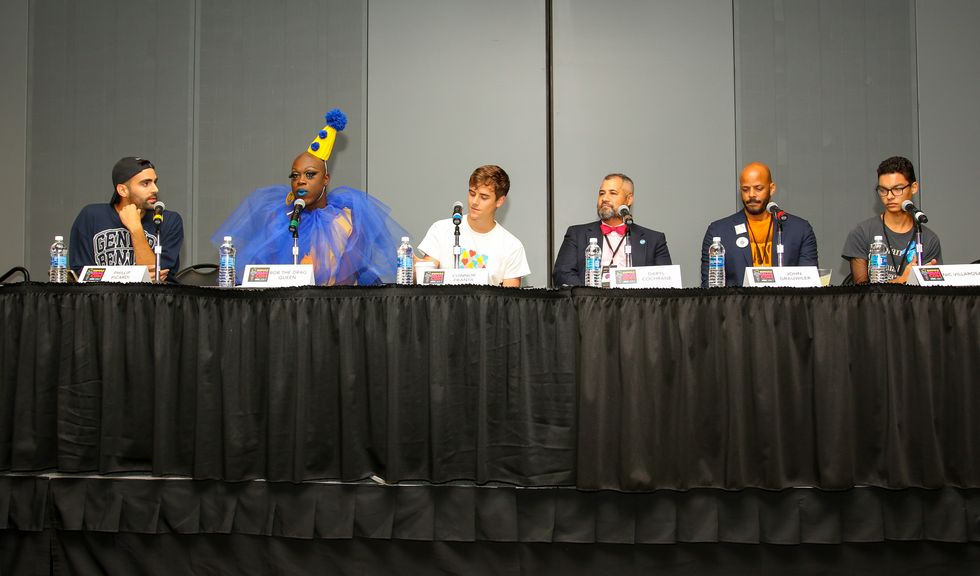 While the commotion on the main floor was endless during the hours the convention was open, something more thought-provoking (and much quieter) was happening in the rooms that lined the side walls: the panels. For the most part, in the past, these panels have functioned as opportunities for fans to hear their favorite queens talk about their favorite things (music, dance, nightlife, fashion, etc.). And this time, it was much the same, with many specifically responding to niche interests of the audience. Both Saturday's "Pushing Buttons" and "Pow! Boom! Zap!" panels come to mind, focusing on gayming (gay video gamers) and comic book fandom, respectively.