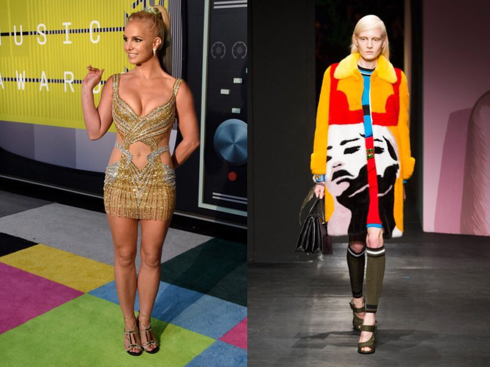 When one imagines the Prada woman, Britney Spears is perhaps the last name one would conjure. And yet for Prada's ebullient Spring 2014 colleciton, it was Spears' anthemic "Work, Bitch!" that blared over speakers, energizing the looks which featured fully articulated women's faces in rainbow brite colors. Pradaphiles might also draw a connection between the call to labor ℅ Britney and Mrs. Prada's past as an active member of Italy's Communist Party in her youth. Workers of the Pradasphere, unite!