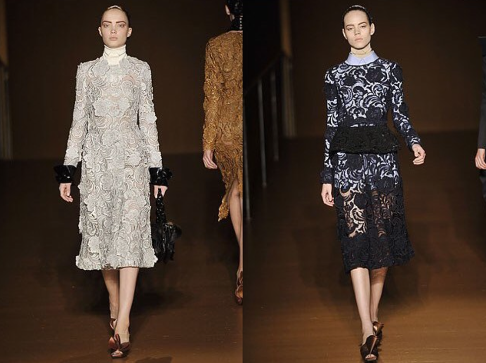 The codes of the haute bourgeoisie are a veritable playground for Mrs. Prada, making no secret of the fact that she is a product of such a system and will from time to time, not so much attack, but hold a kind of fun house mirror up to it. For Fall 2008, she took the emblematically mumsy material of guipure lace and spun it to glorious ends. She joked that they had all of Switzerland working on the sinister but riveting pieces.