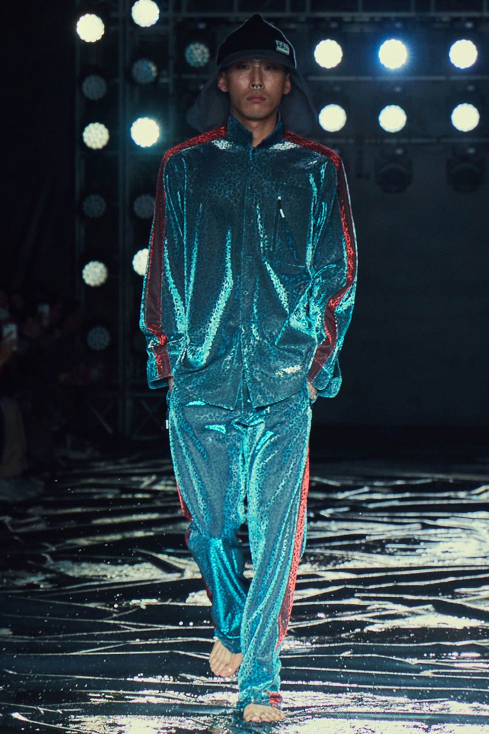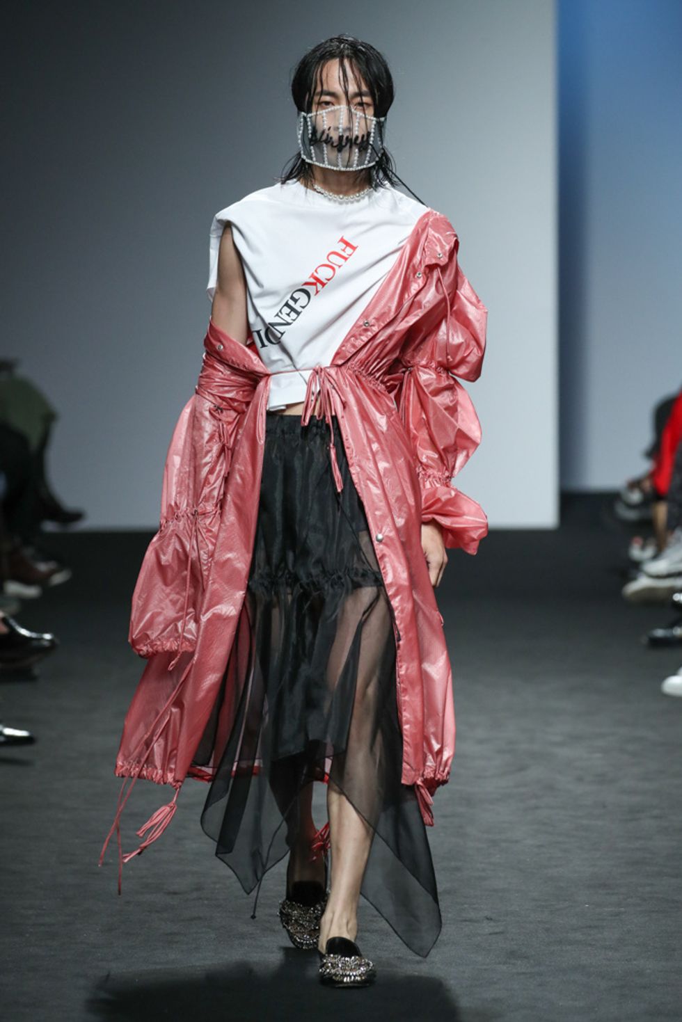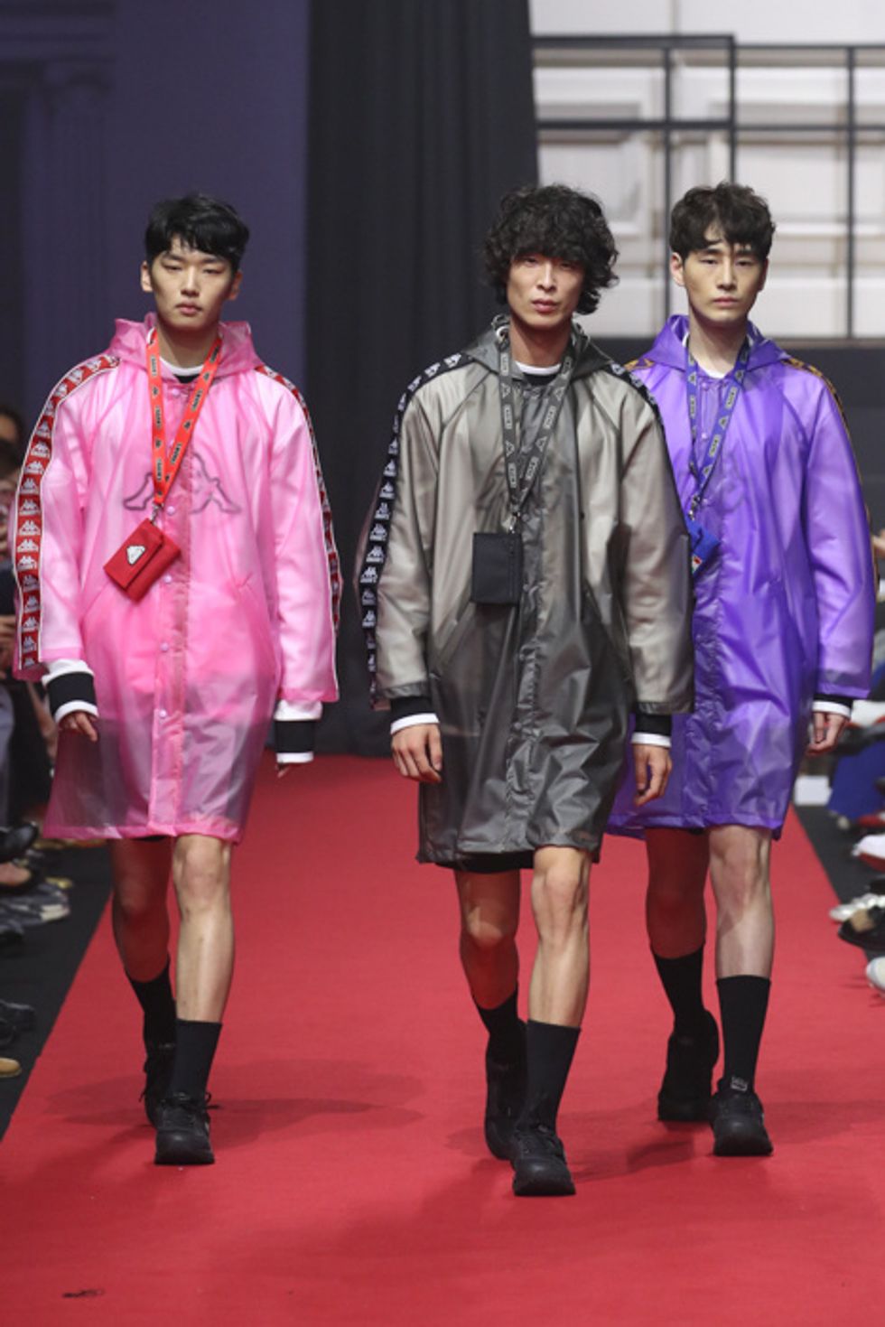 A label called Charm's sent out a trio of guys in see-through rain coats made in collaboration with Kappa. Squad.