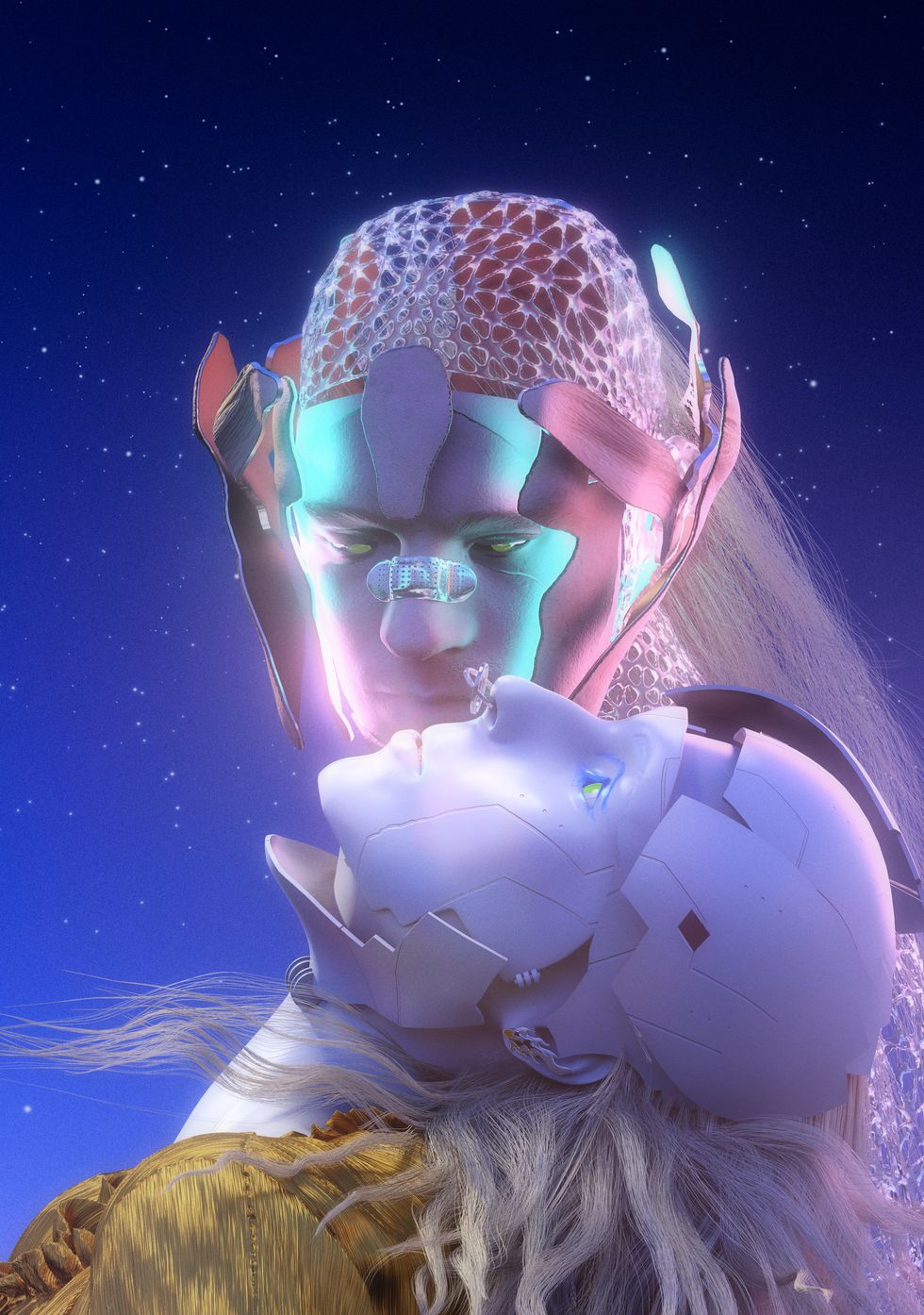 The experimental production began with a Zoom — connecting with each talent over video and talking them through the process of a face/ head scan iPhone app. Once the rough scans were exported, Huynh went back in to fine-tune facial details, humanizing the rudimentary imagery. Alongside subjects' features, Huynh's team sculpted digital bodies posing talent into positions that would match their unique environments, which were also digitally made by hand.