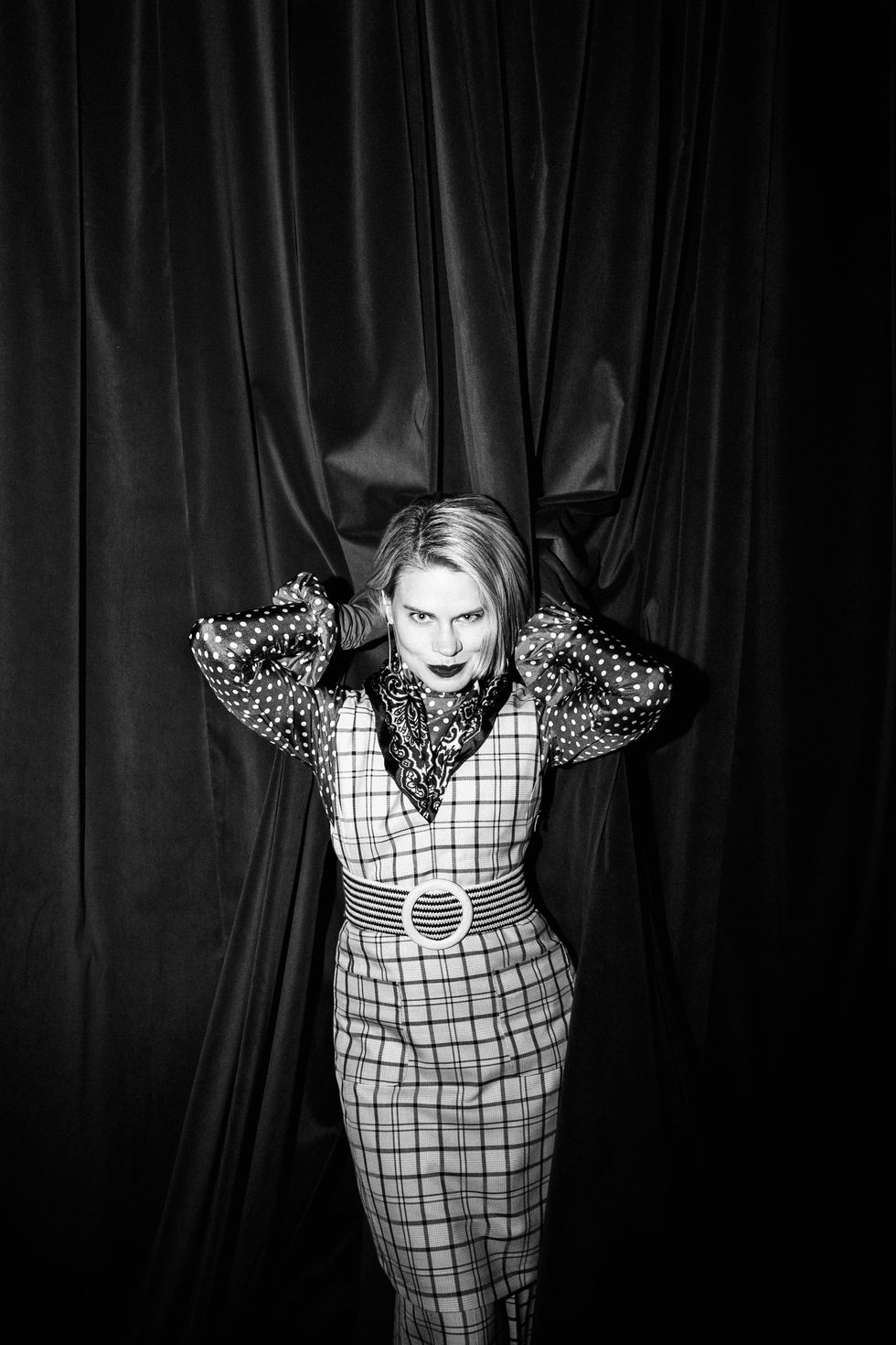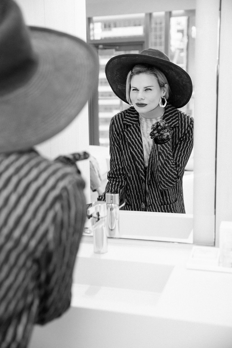 Hat: Ruslan Baginskiy, Outfit: Delacruz, Shoes: Sergio Rossi, Earrings & Ring: Lady Grey