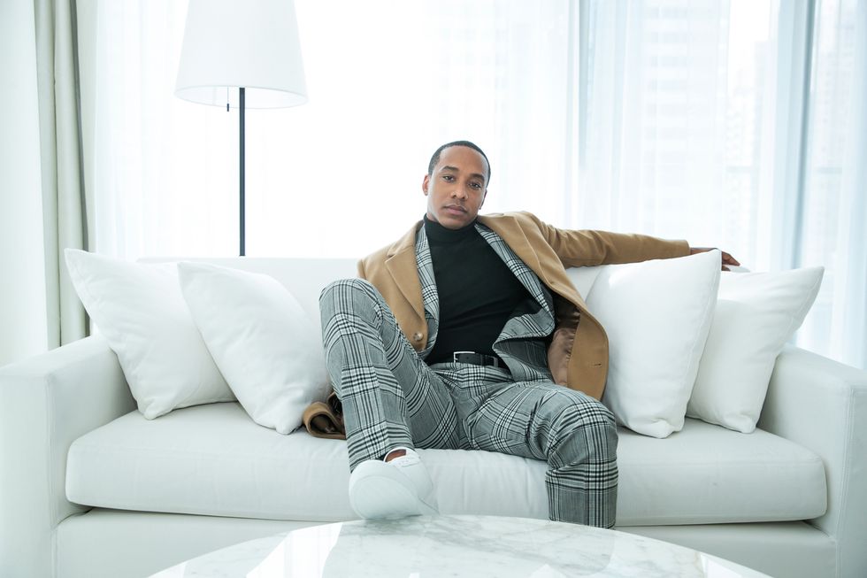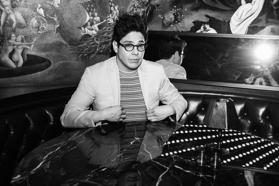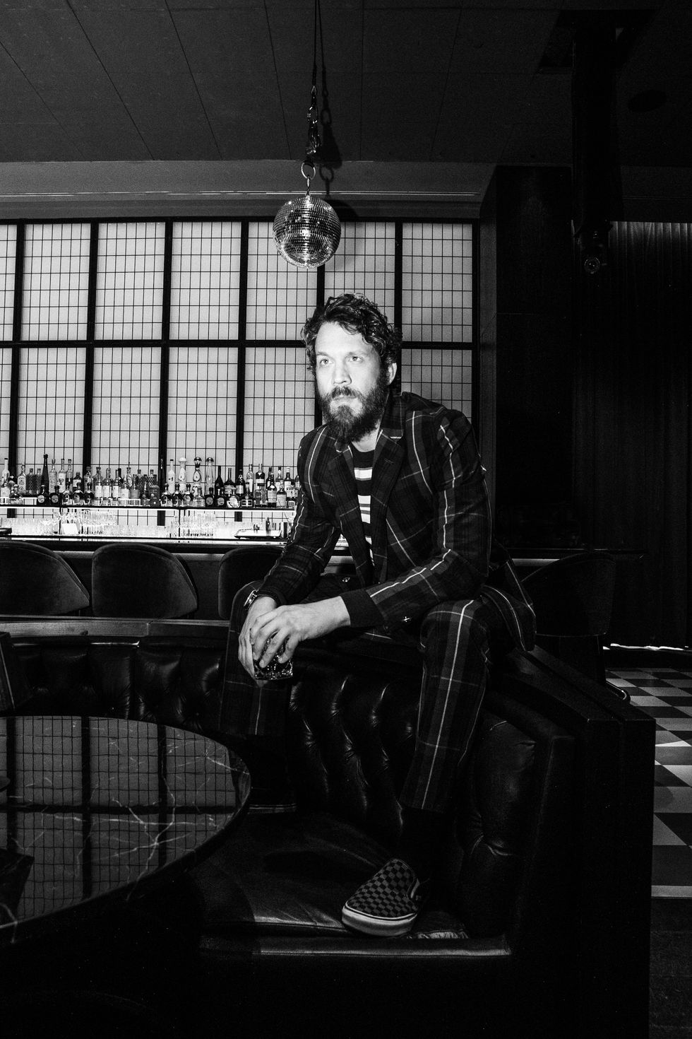 Suit: Rowing Blazers, Sweater: Maison Kitsuné, Watch: Shinola, Belt: Trafalgar, Shoes: Vans