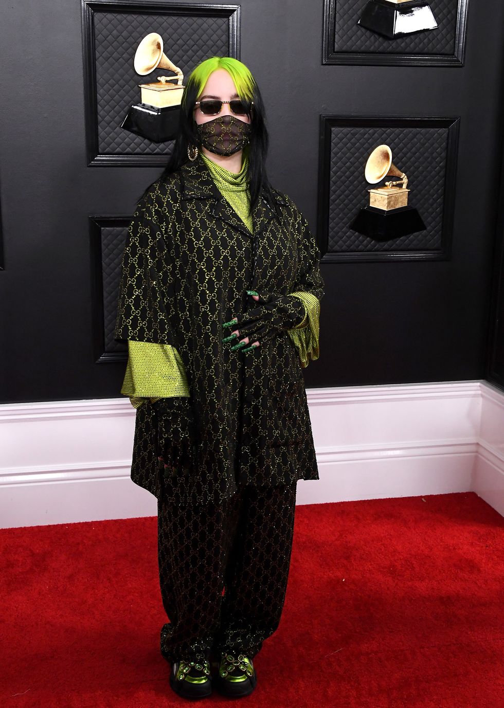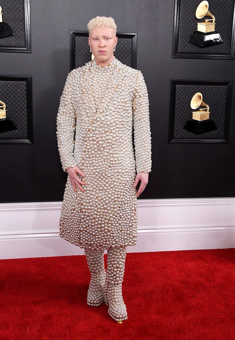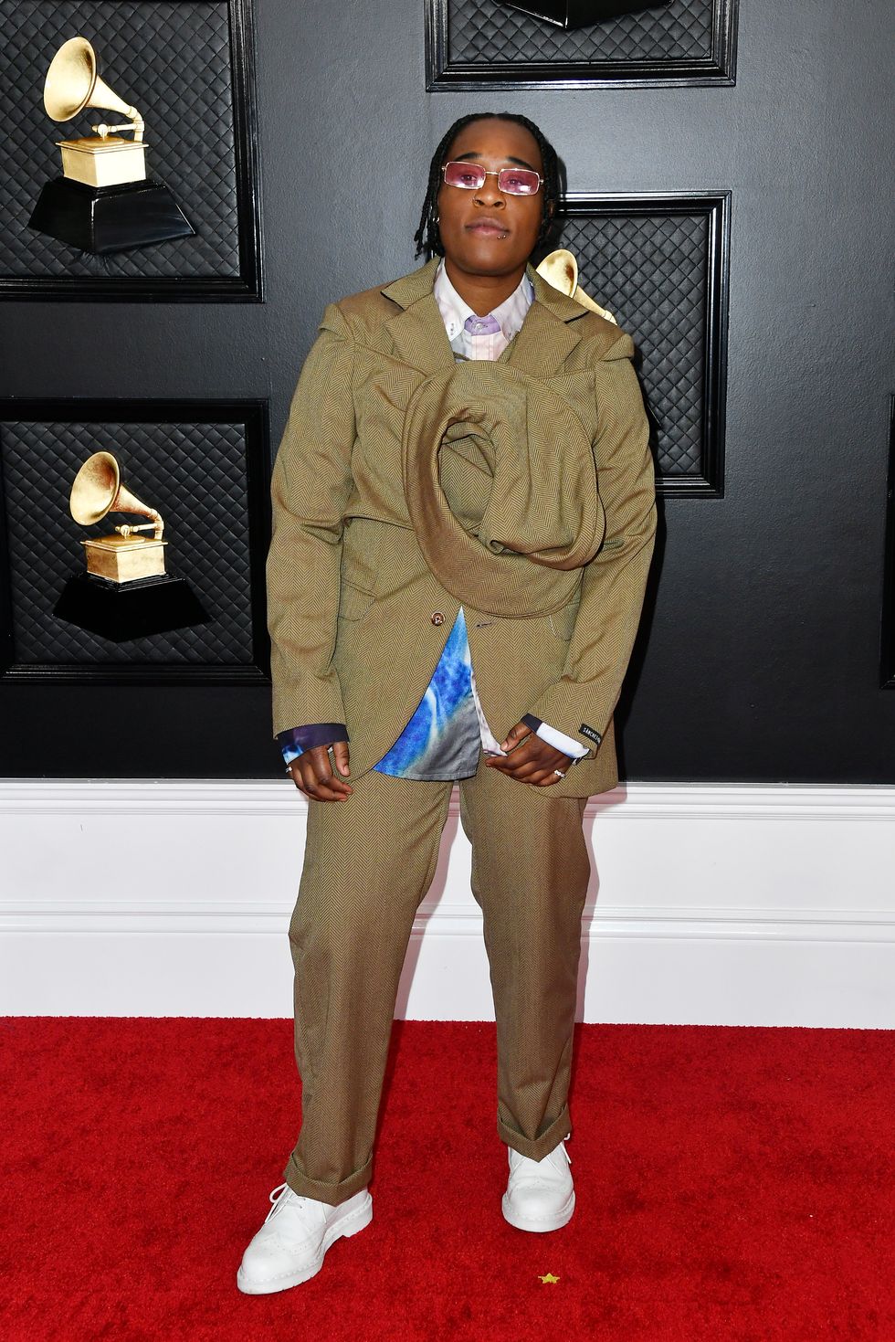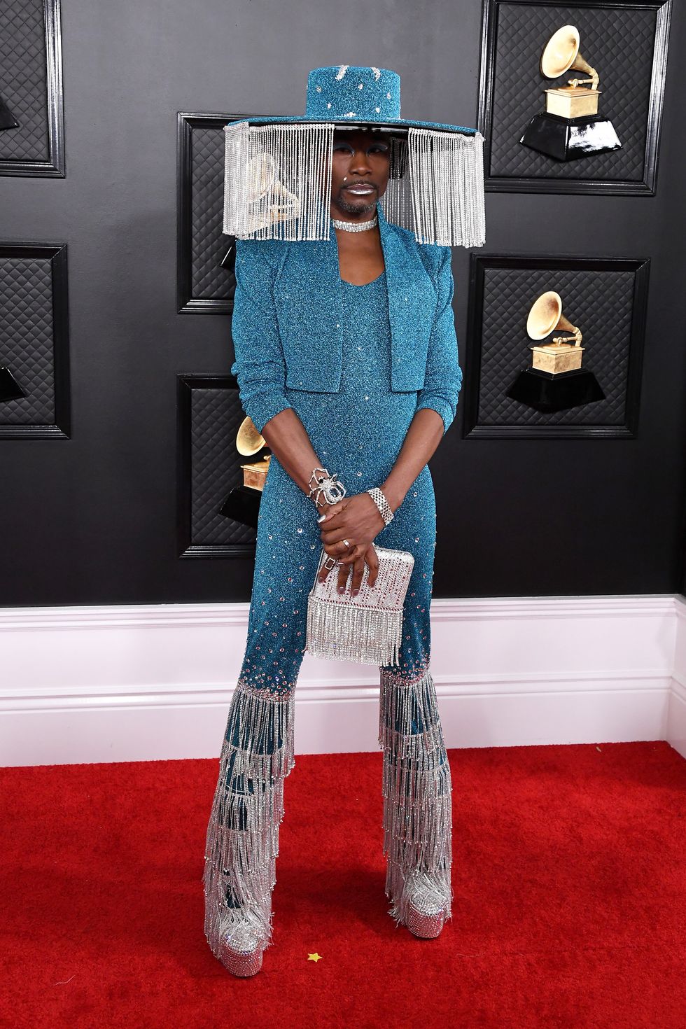 Lil Nas X was hard to miss with his neon pink cowboy outfit. Ariana Grande — who makes her return to the Grammys stage — also showed up in a grand, cloud-like vision of a Giambattista Valli creation. And Billy Porter did not disappoint with his shimmering blue, custom Baja East crystal-drenched flare jumpsuit and jacket.