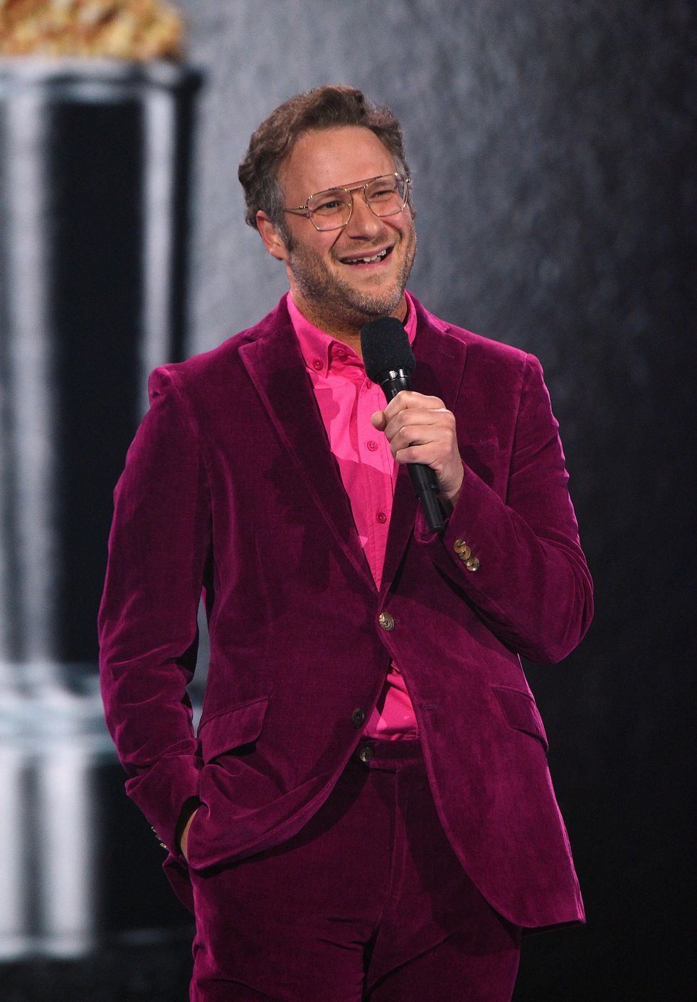 At the MTV Movie & TV Awards, an award show name that will never no be an absolute clunker, Seth Rogen did what had to be done in a toasted plum velvet Etro suit paired with an electric pink shirt. Everybody say, “Thank you, Seth Rogen.”