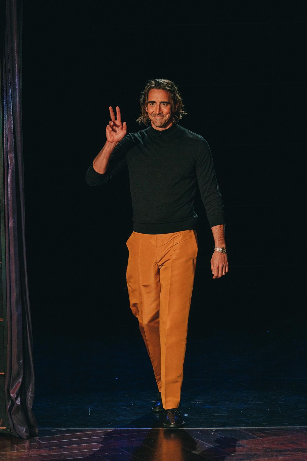 6’5” actor Lee Pace wore this Zegna top paired with bespoke burnt orange silk faille trousers (his hip bone generously on display) on The Late Late Show With James Corden, where he revealed that he built his house by hand. A moment most pleasing.