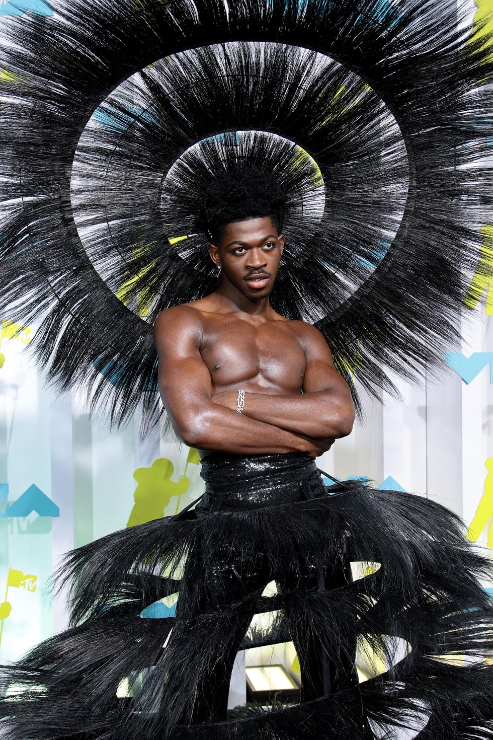 Lil Nas X stole the show Sunday night, stepping out in a dramatic feathered hoop skirt and matching headpiece. No shirt was necessary to complete this sculptural look, designed by Harris Reed. After the show, Nas carried his VMA trophies back onto the carpet in a custom Marko Monroe cut-out dress.