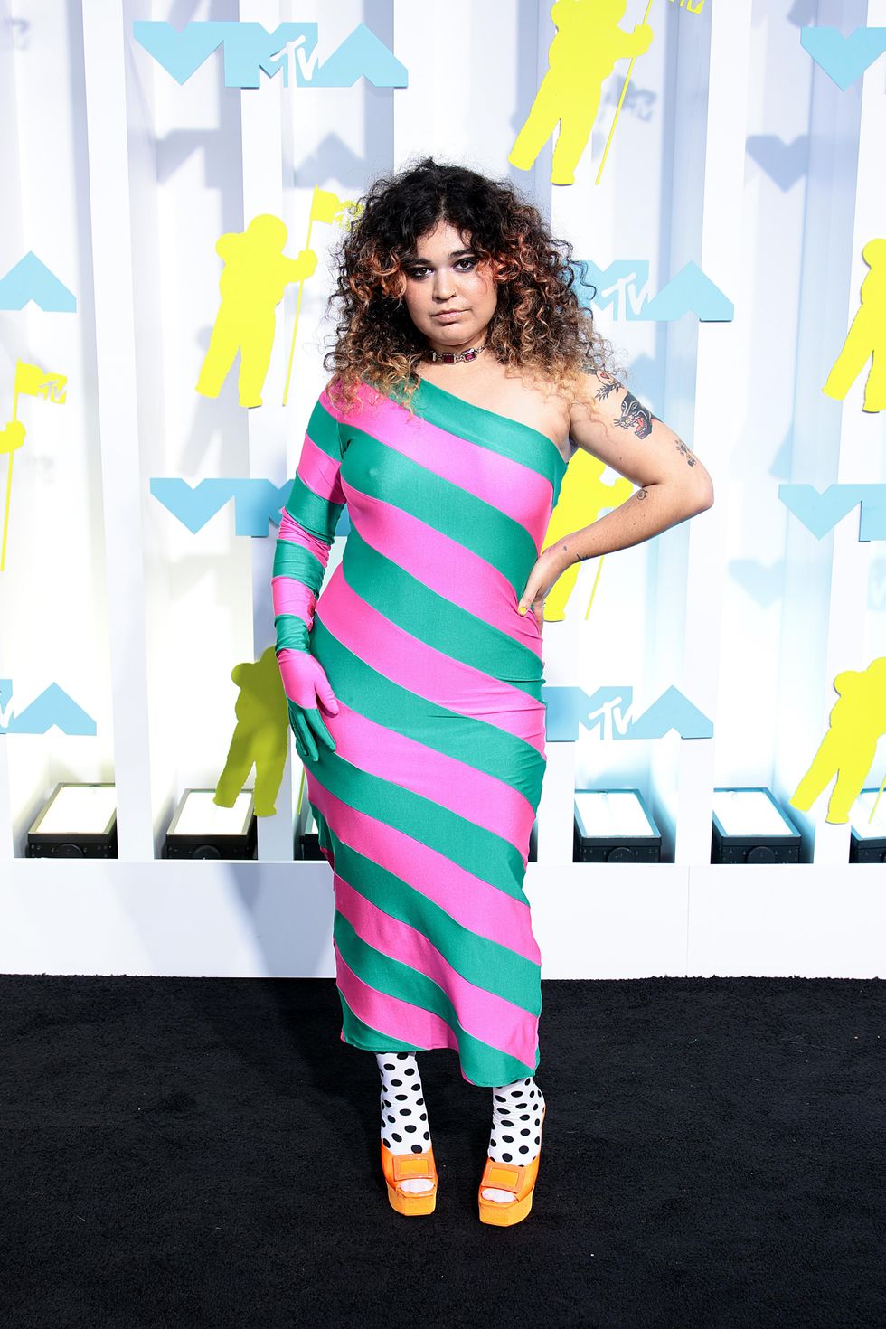 Among a sea of dark hues on the black carpet, Remi Wolf stepped out in a daring one-sleeved pink and green striped dress that she paired with polka dot tights and orange platform heels. The look was designed by New York-based independent designer Lirika Matoshi.