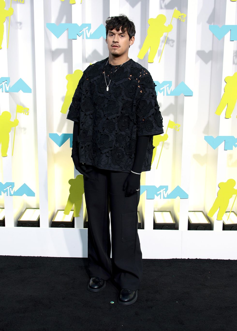 Subtle and chic, Omar Apollo wore head-to-toe Valentino. The look consisted of an embroidered floral top paired with clean, simple trousers. The black opera-length gloves and subdued jewelry completed Apollo's understated but fashionable appeal.
