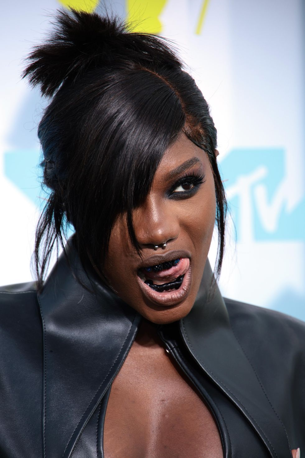 Breakout rapper Doechii brought a dominatrix-matrix fusion with her cyber black grills and metal spike protruding from her ear. The artist matched her grills with a black smokey eye and '90s updo by hair stylist Dhairius Thomas.