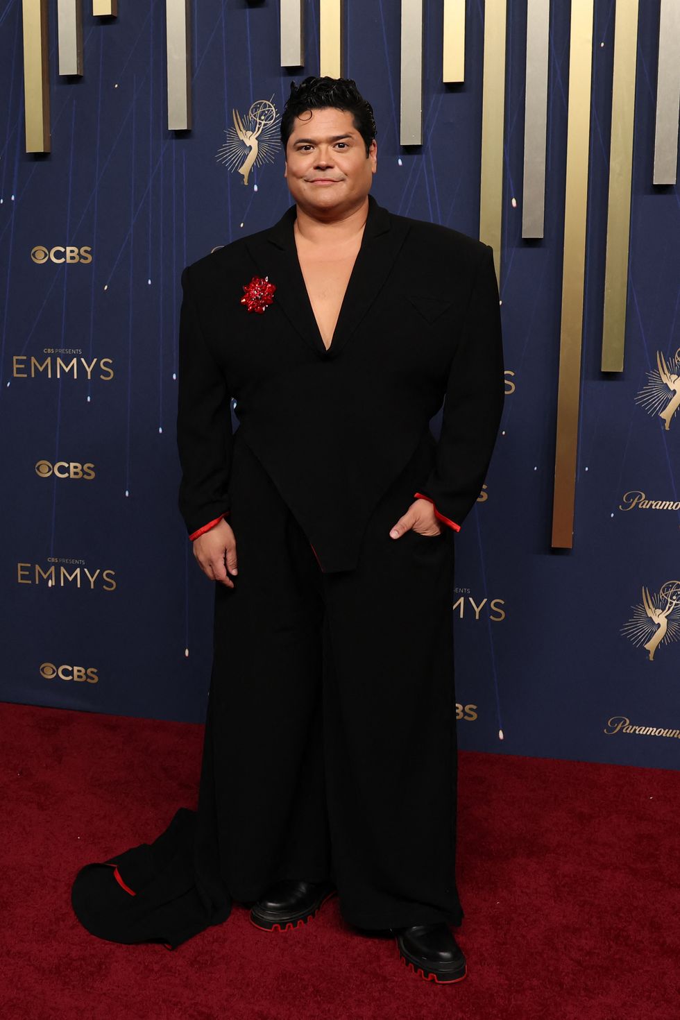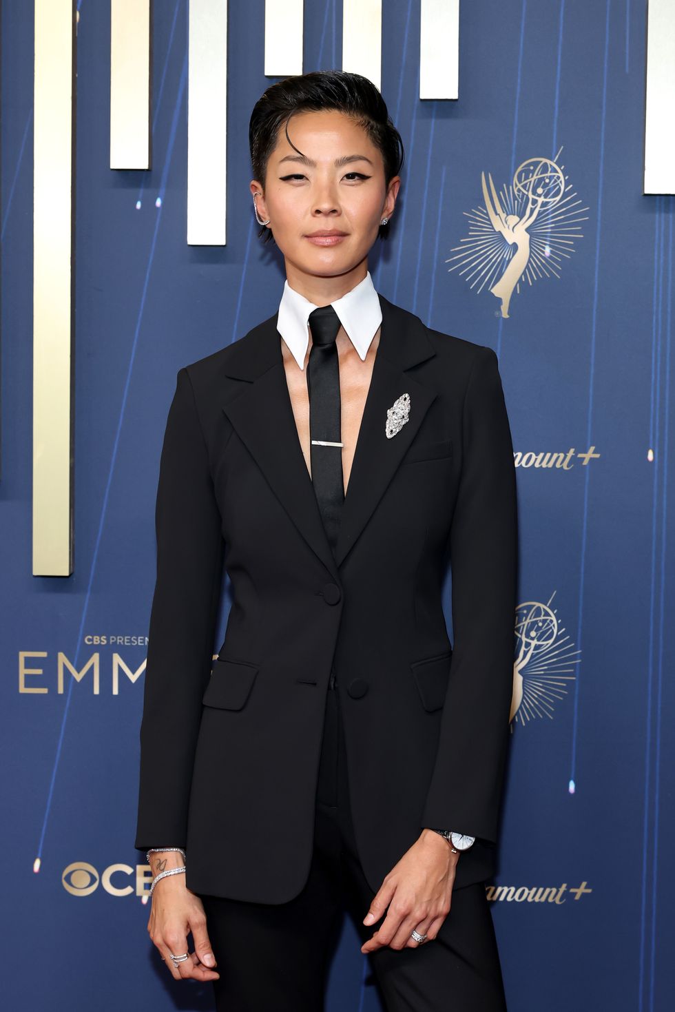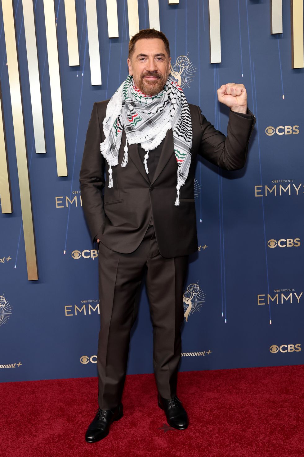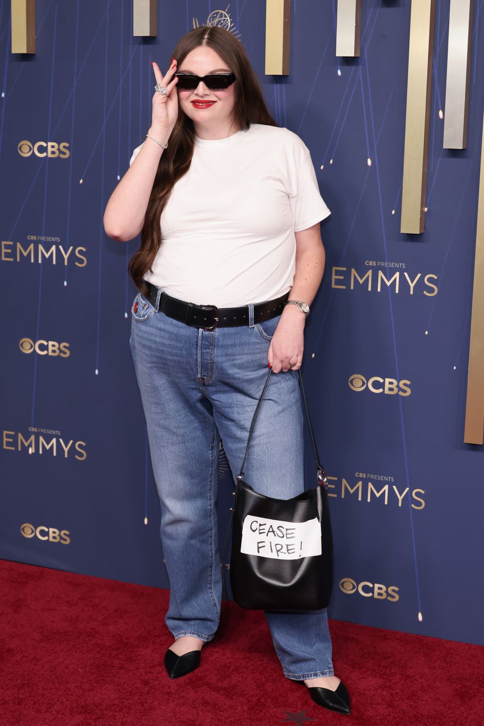 Here we have contrasting protest looks, courtesy Meg Stalter and Javier Bardem. While we saw those pins elsewhere, these were the most explicit of the Palestine mentions on the carpet fashion front. While Bardem's keffiyah is admirable and touching, it's Stalter that really pulls off the "protest" in protest look. Rather than try and elevate herself through the mention of Palestine sartorially, she has bucked the entire thing and worn jeans and a white t-shirt to the Emmys. It's something I have never seen before in the seven years I've been covering red carpet fashion, least of all for a cause like Palestine. While the efficacy of these messages is rightly debated by advocates and Palestinians themselves, she chose her beliefs over the sanctity of the event. That, in and of itself, speaks to richness of her spirit and character.